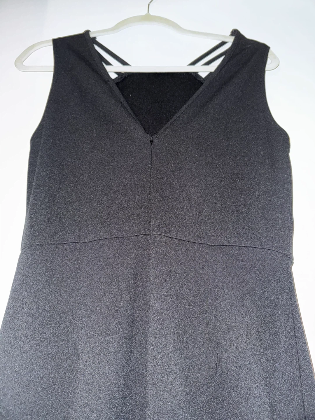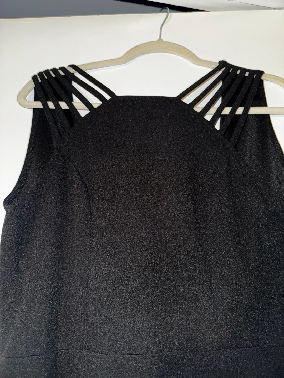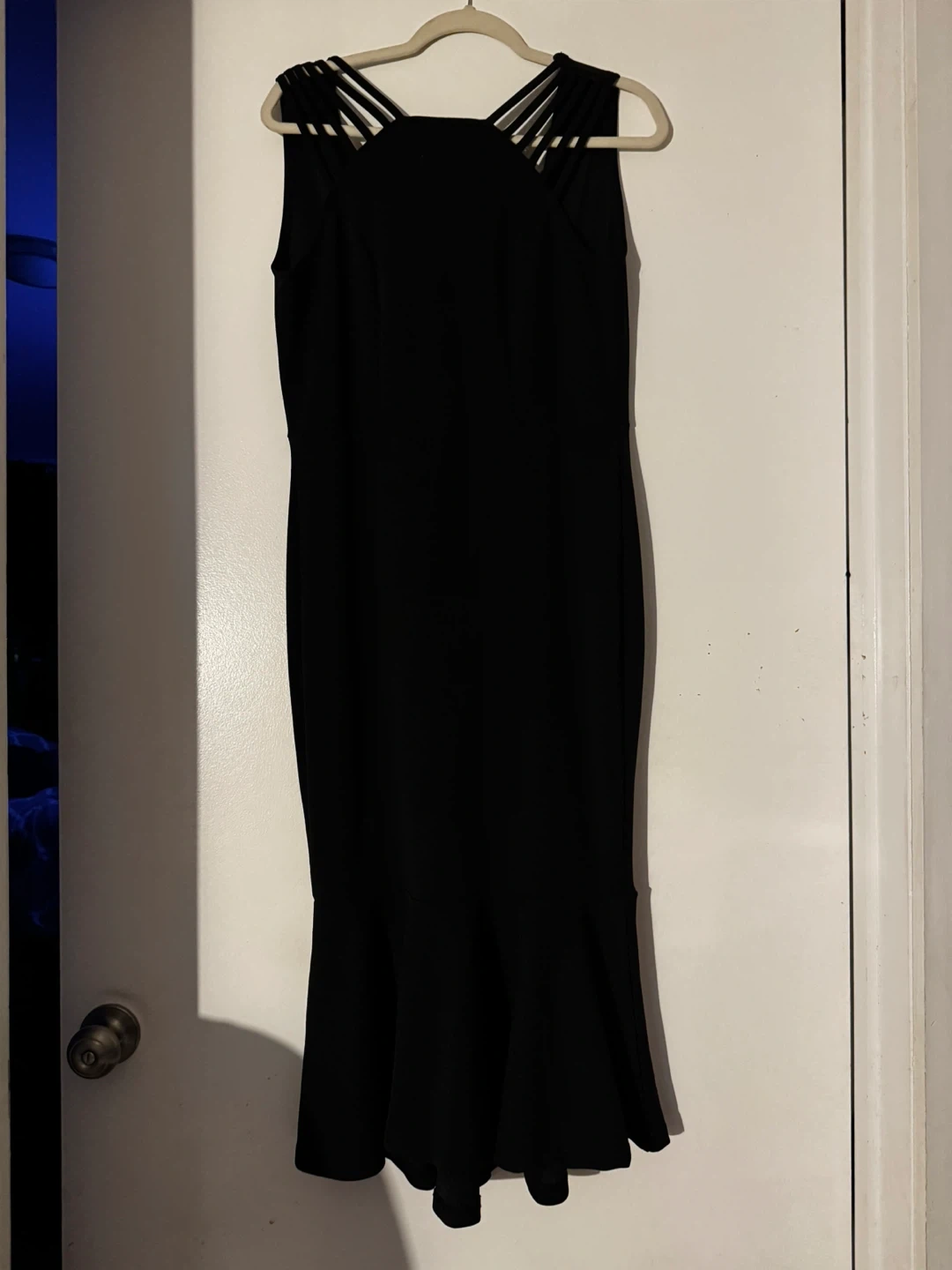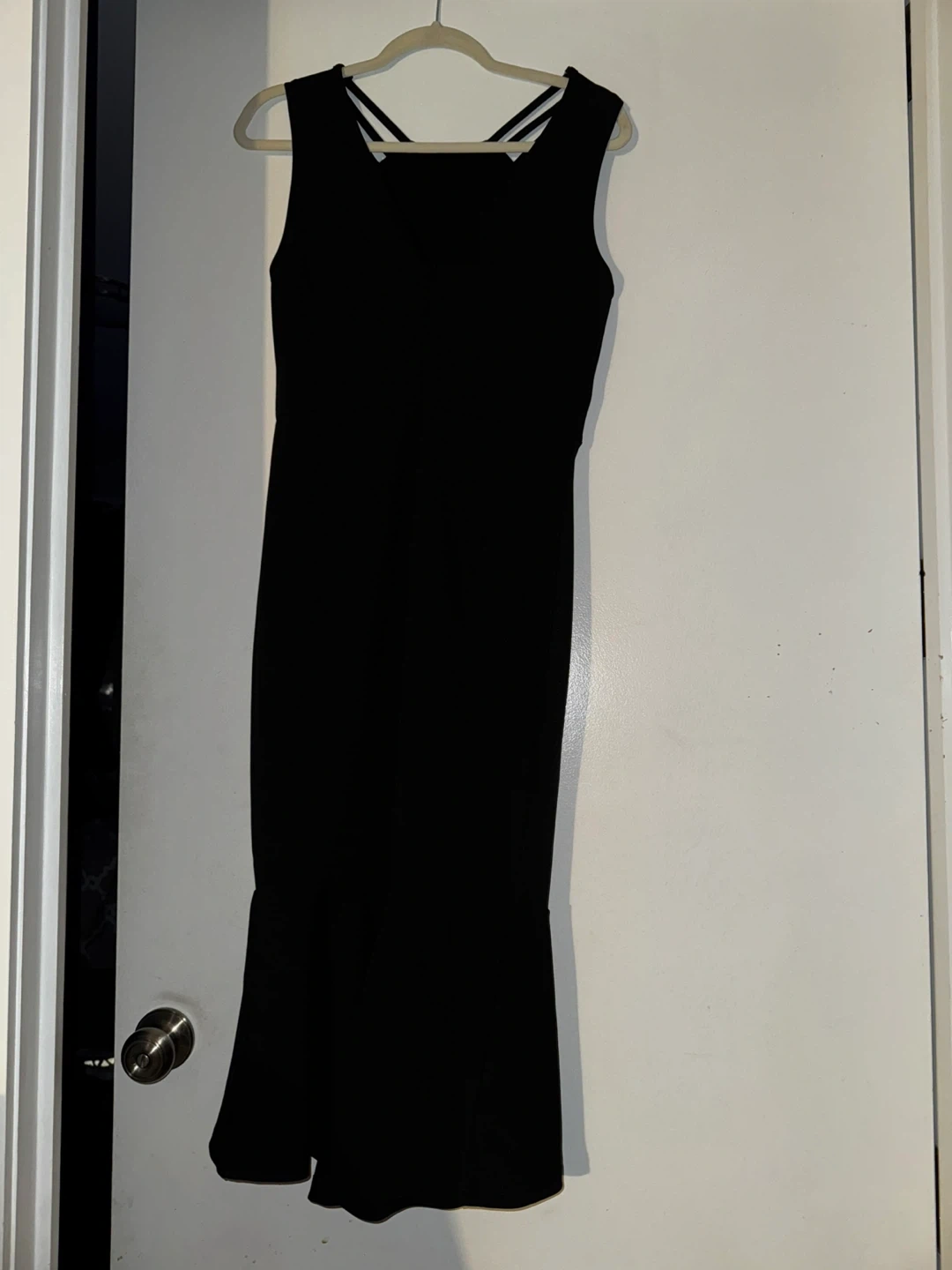 Selling a black sleeveless dress. It has a unique strap design on the shoulders and a fitted silhouette that flares out at the bottom. It's in great condition and ready for a new home!