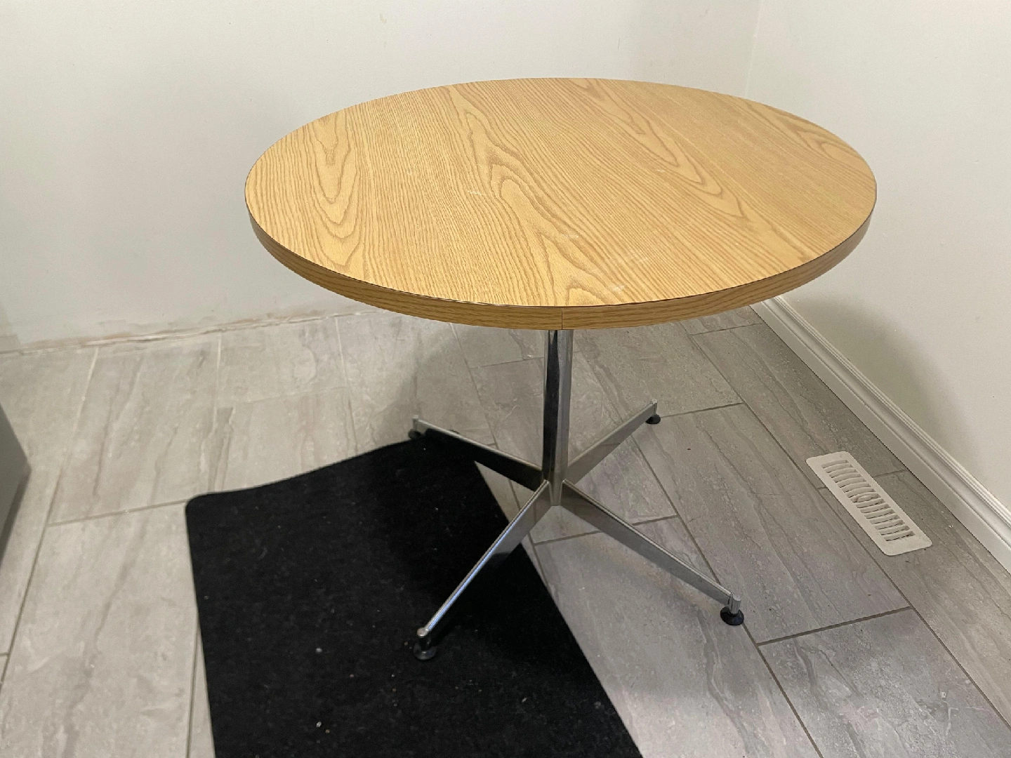 A simple round side table with a light wood top and a metal base. It's in good condition and would be a great addition to any living room or bedroom