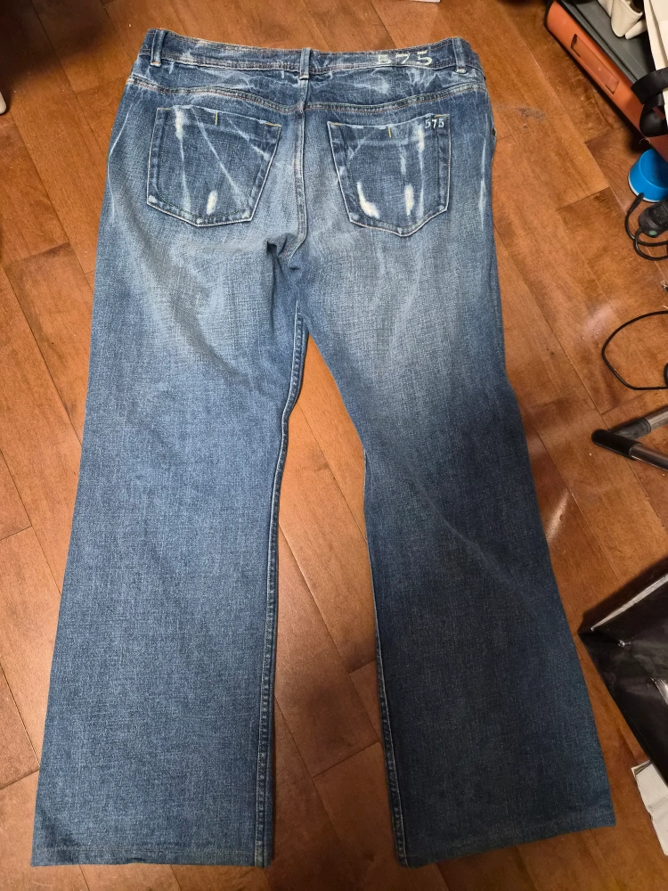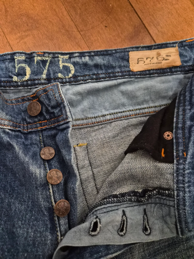 Selling a pair of 575 denim jeans. They have a unique wash and button-fly closure. These jeans are in good condition and ready for a new home!