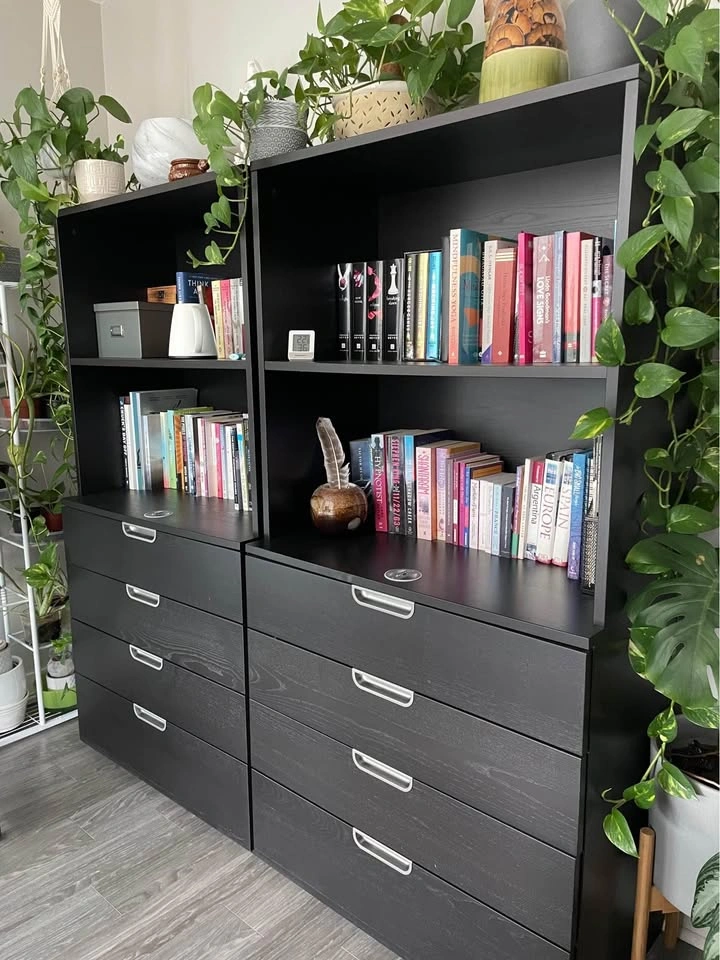 A combination of open and closed storage with half drawers and half bookshelves. One available for sale. Bought for over $1,000 Dimensions: 31.5” wide x 17.75” deep (at the deepest part which is the bottom drawers) x 63” tall
