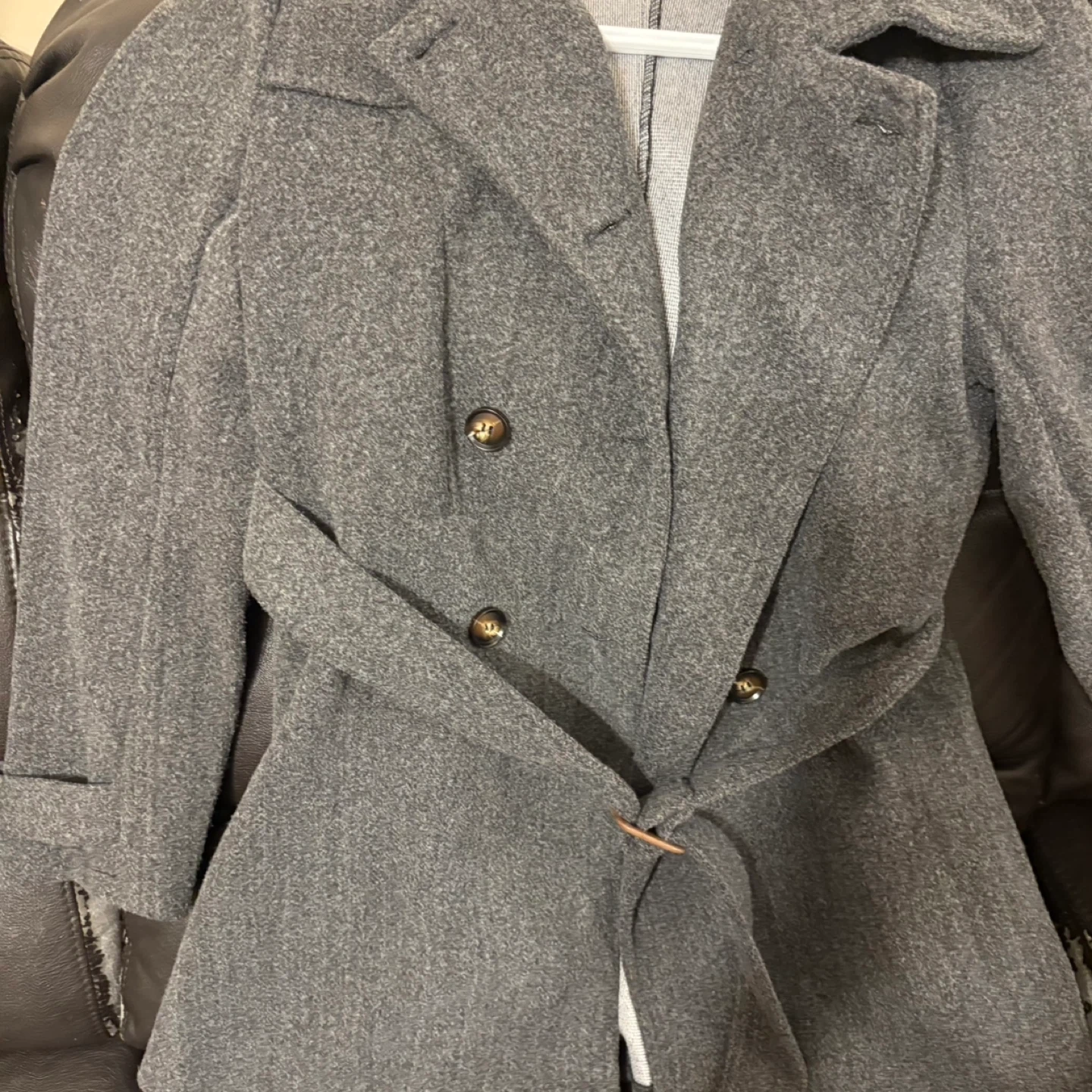 Selling a stylish grey trench coat! It features a classic double-breasted design with a tie belt. Perfect for layering and adding a touch of sophistication to any outfit. It's in great condition and ready for a new home