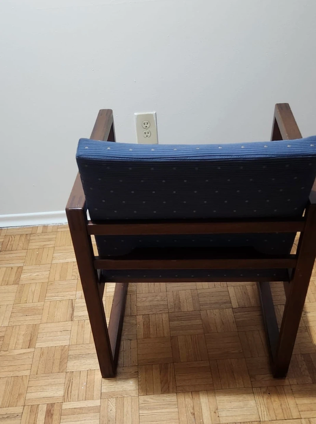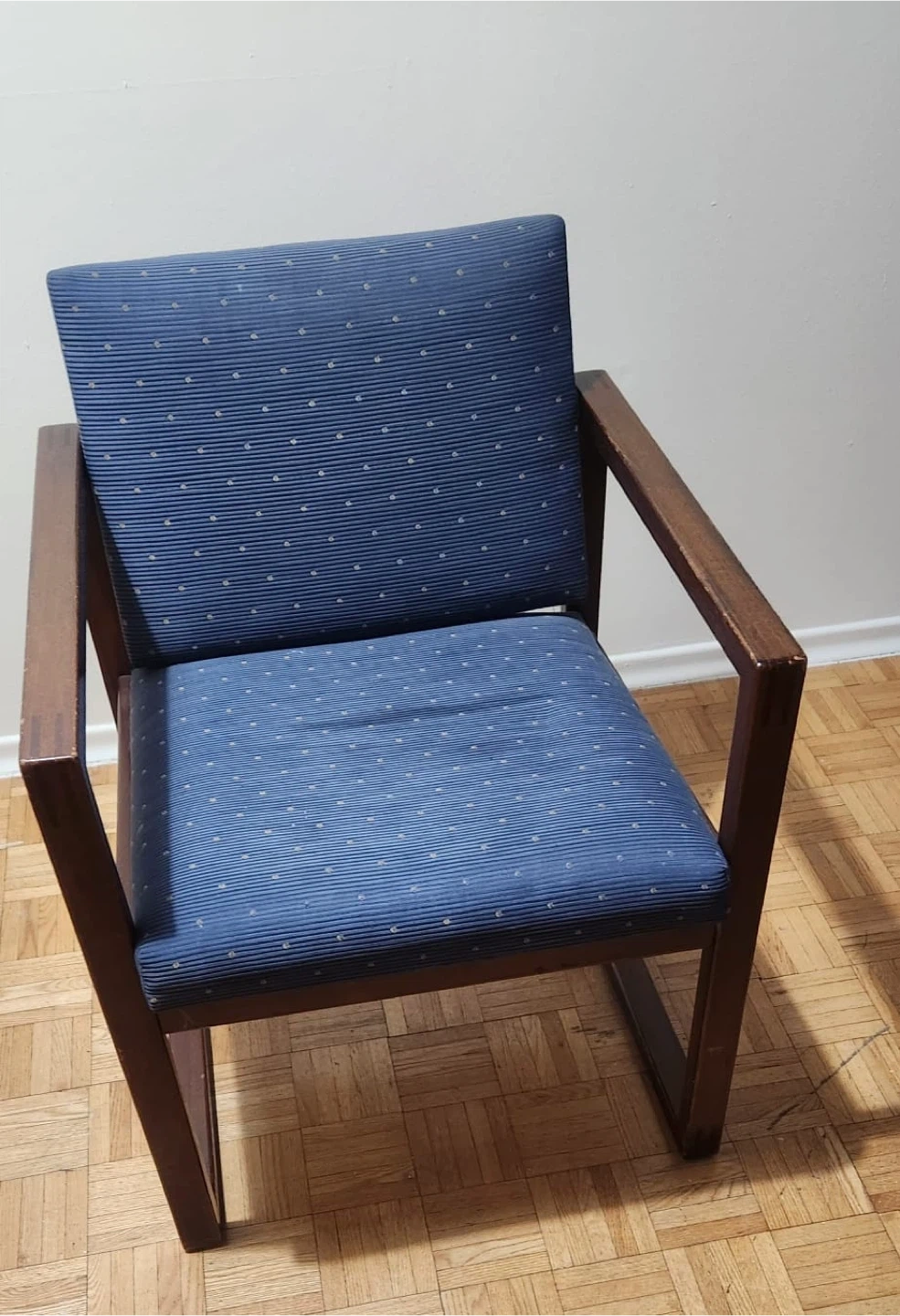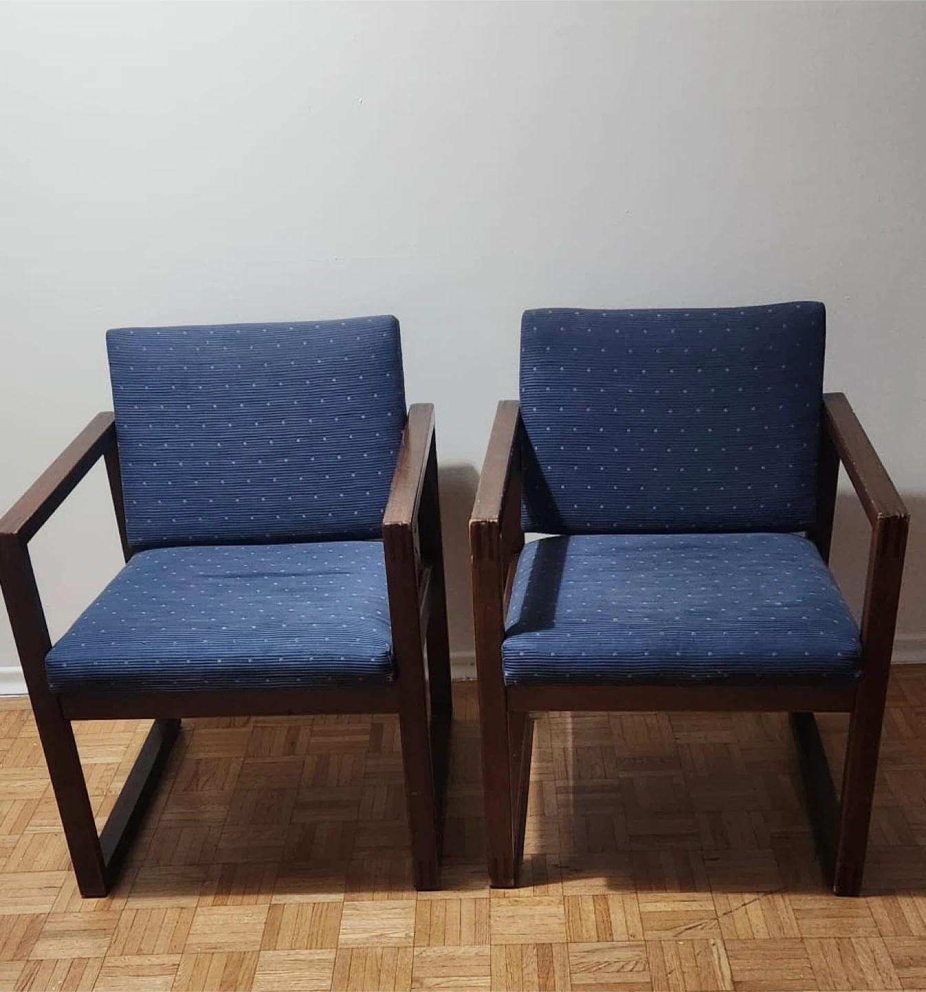346PICK UP ONLY Selling a pair of arm chairs with blue upholstered cushions and backrests. The frames are a wood-like material. They're in good condition and would be great for a living room or office space