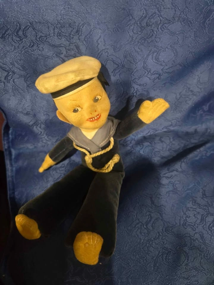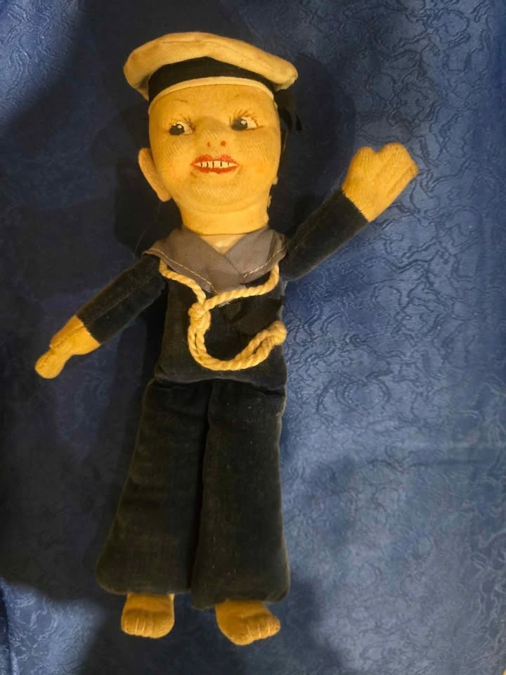 Handmade in England During WW2- The Jolly Sailor Doll by Norah Wellings is a timeless treasure, one of the last few made, shortly this doll was made just before Nora decided to stop making dolls and burned all designs and incomplete dolls shortly after the war. A Rare Gem!