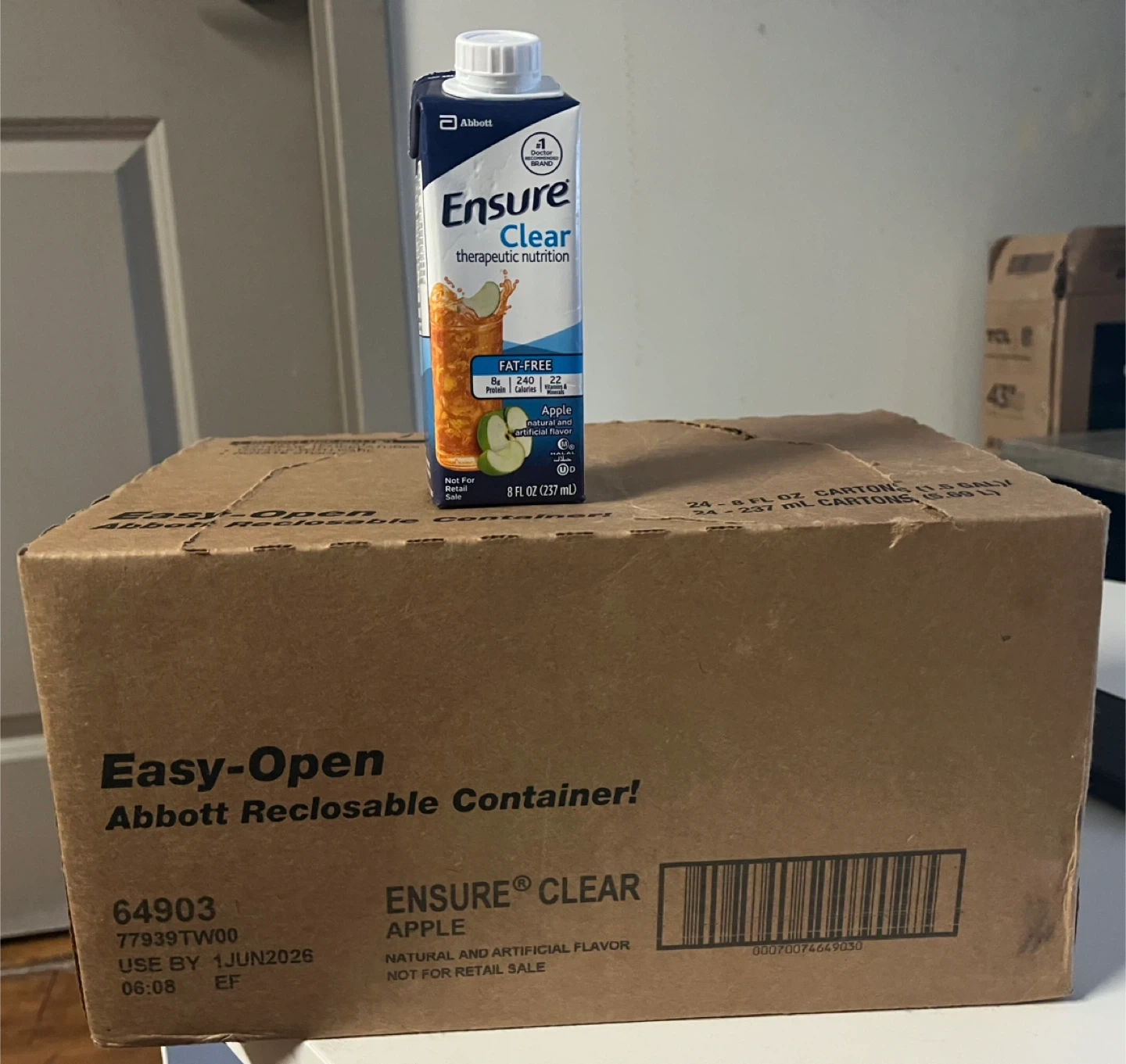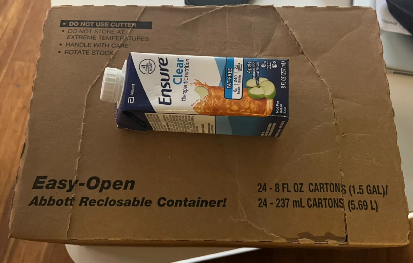 Ensure Clear Therapeutic Nutrition Drink, Apple Flavor, 8 Oz, Carton, 240 Calories, Ready to Use, 24 Count. Carton opened to take pictures. A nutrition drink that contains high-quality protein. From smoke pet free and a healthy home.