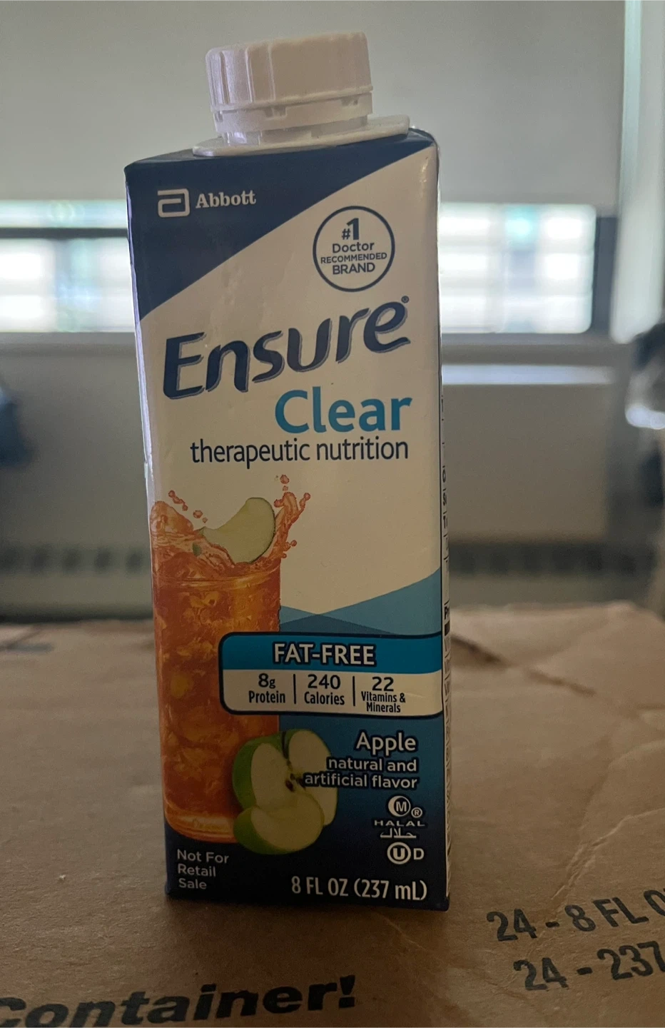 Ensure Clear Therapeutic Nutrition Drink, Apple Flavor, 8 Oz, Carton, 240 Calories, Ready to Use, 24 Count. Carton opened to take pictures. A nutrition drink that contains high-quality protein. From smoke pet free and a healthy home.