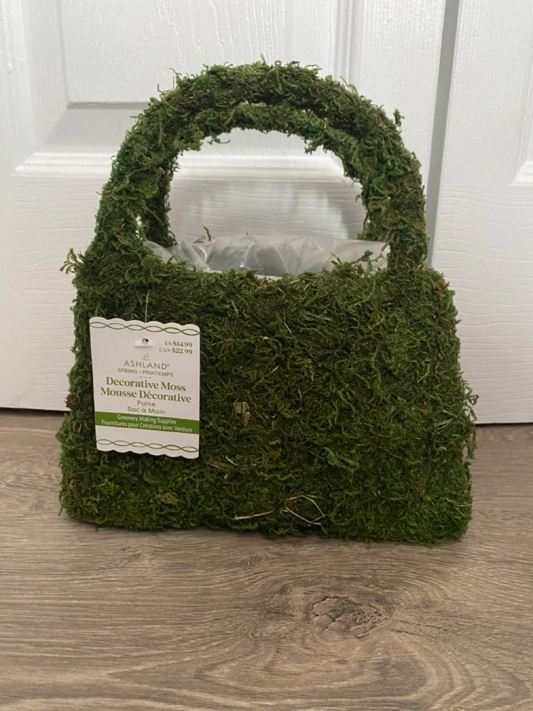 Little moss covered purse planter with plastic liner. 2 available. 9 inches tall, 9 inches across and 4 inches wide. Pick up in Madoc. $10 each.