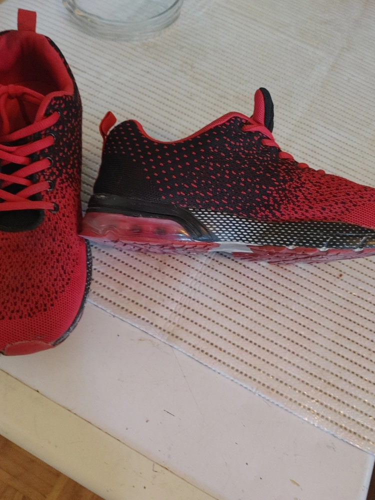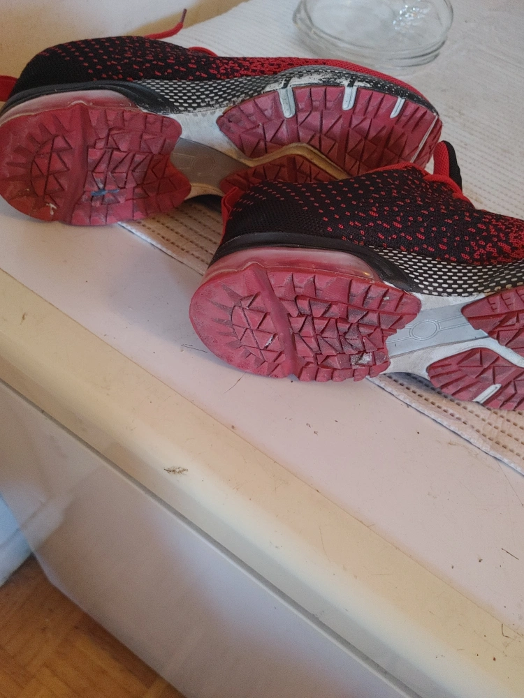 Selling a pair of red and black running shoes. They show some signs of wear, especially on the soles, but still have lots of life left in them! Great for jogging or everyday wear