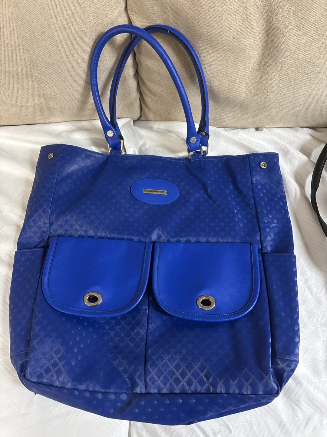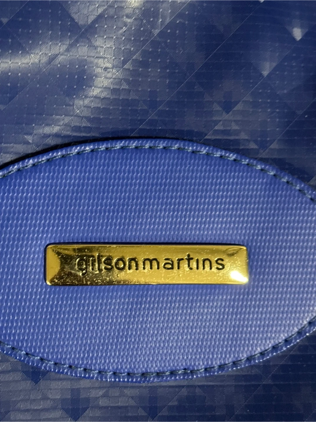 I'm selling a blue tote bag by Gilson Martins. It's in great condition and has a vibrant red interior. Perfect for carrying your essentials in style!