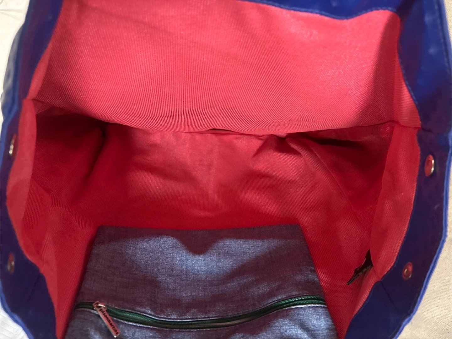 I'm selling a blue tote bag by Gilson Martins. It's in great condition and has a vibrant red interior. Perfect for carrying your essentials in style!