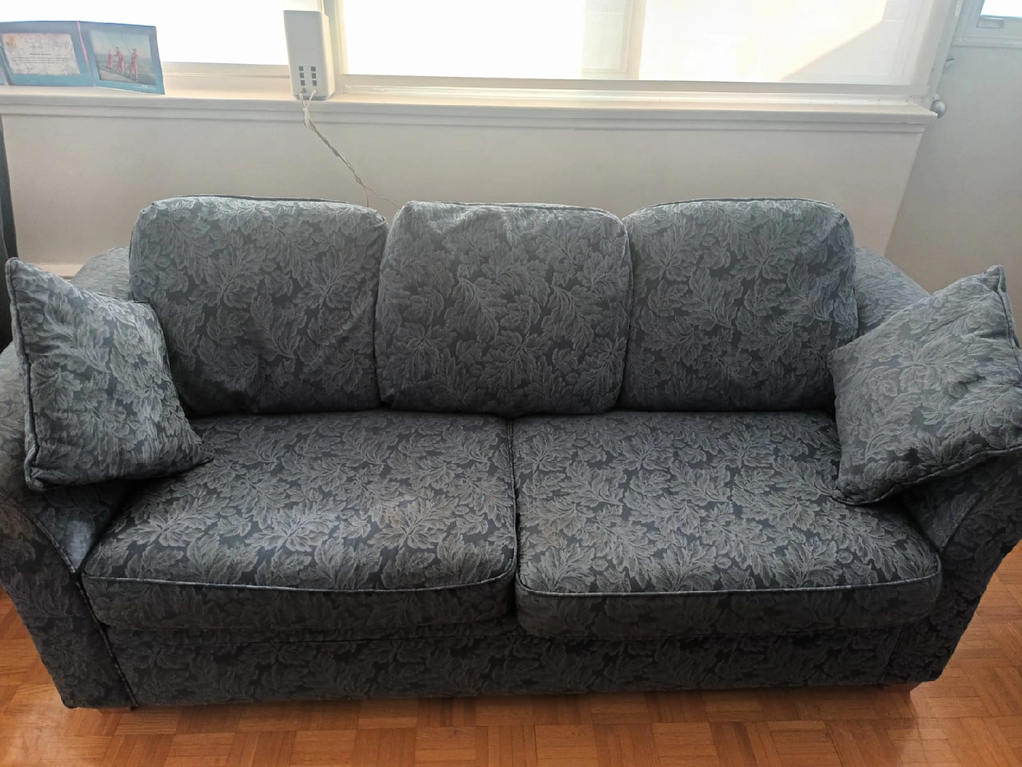 Comfortable three-seat sofa with a lovely floral pattern. This couch is perfect for a living room or den. It comes with matching throw pillows to complete the look. it also opens into a bed.