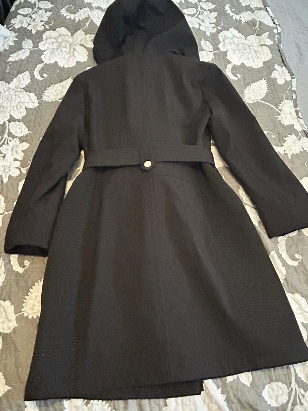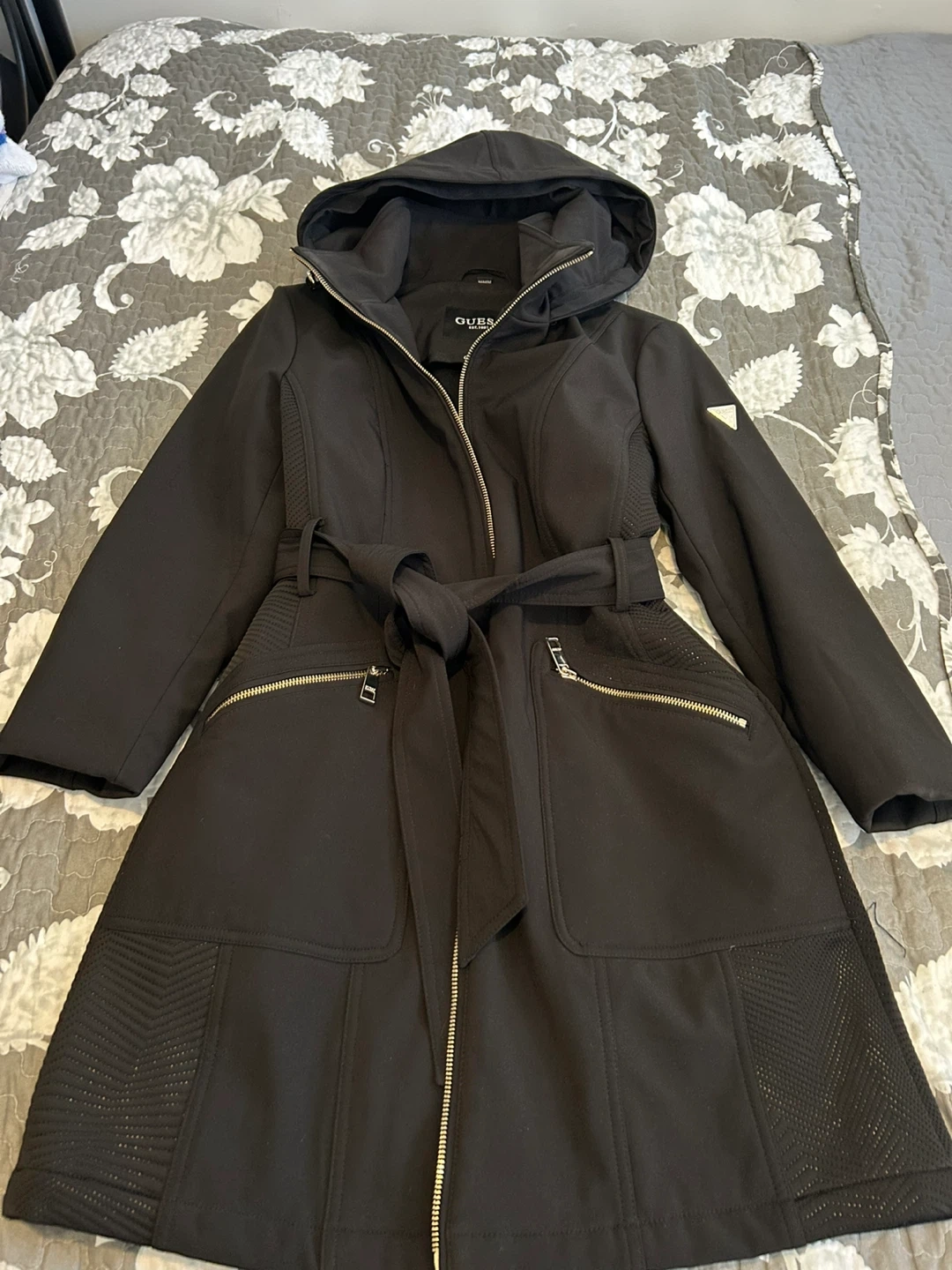 Check out this stylish black trench coat from Guess! It features a flattering belted waist and a convenient hood, perfect for those unpredictable weather days. The coat is in great condition. Medium size.
