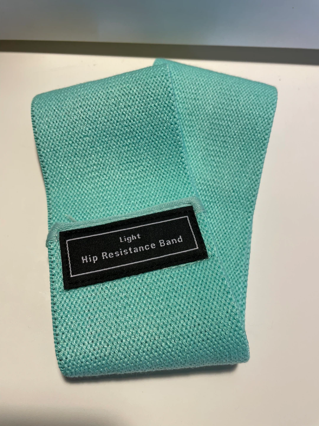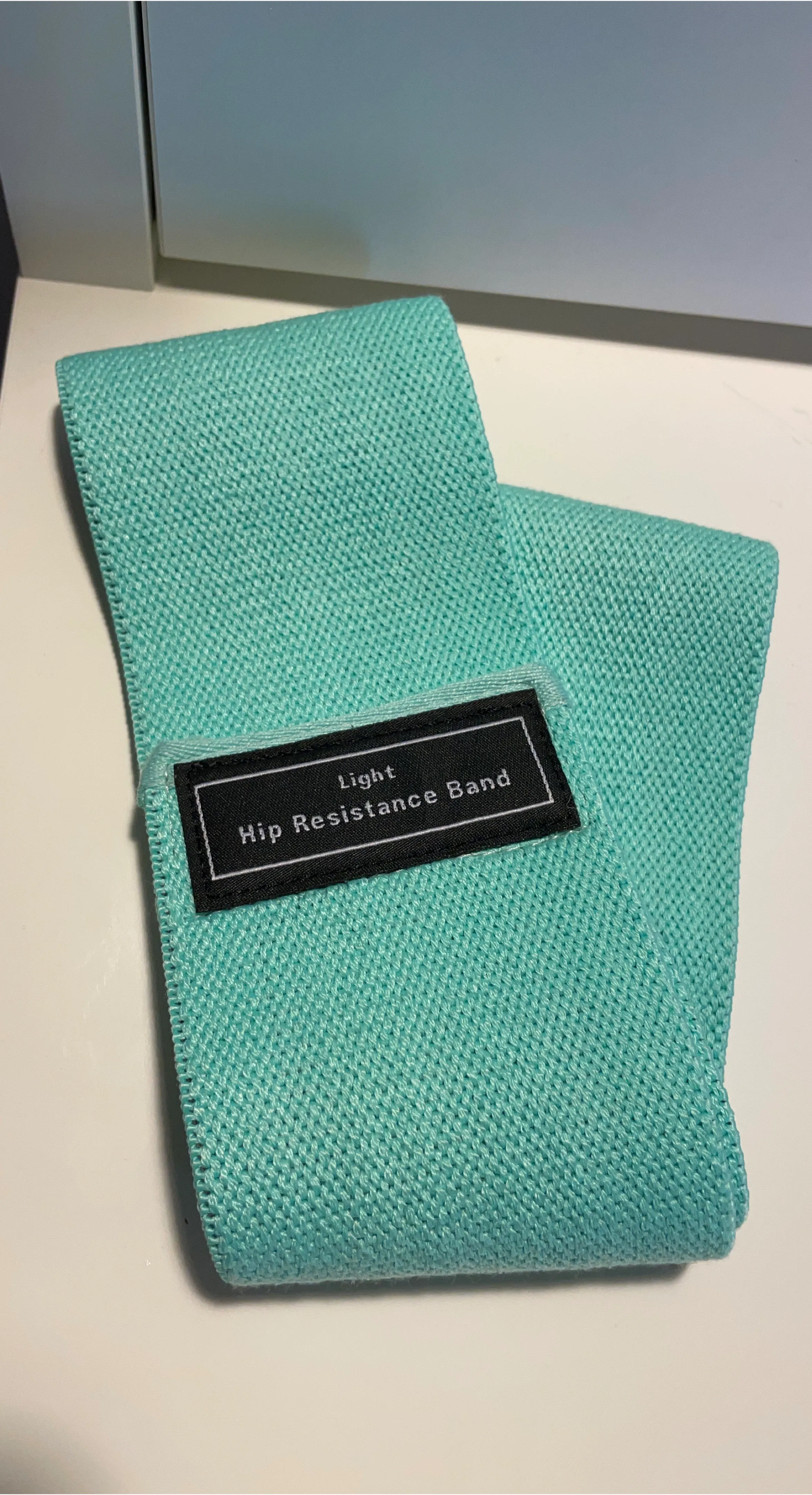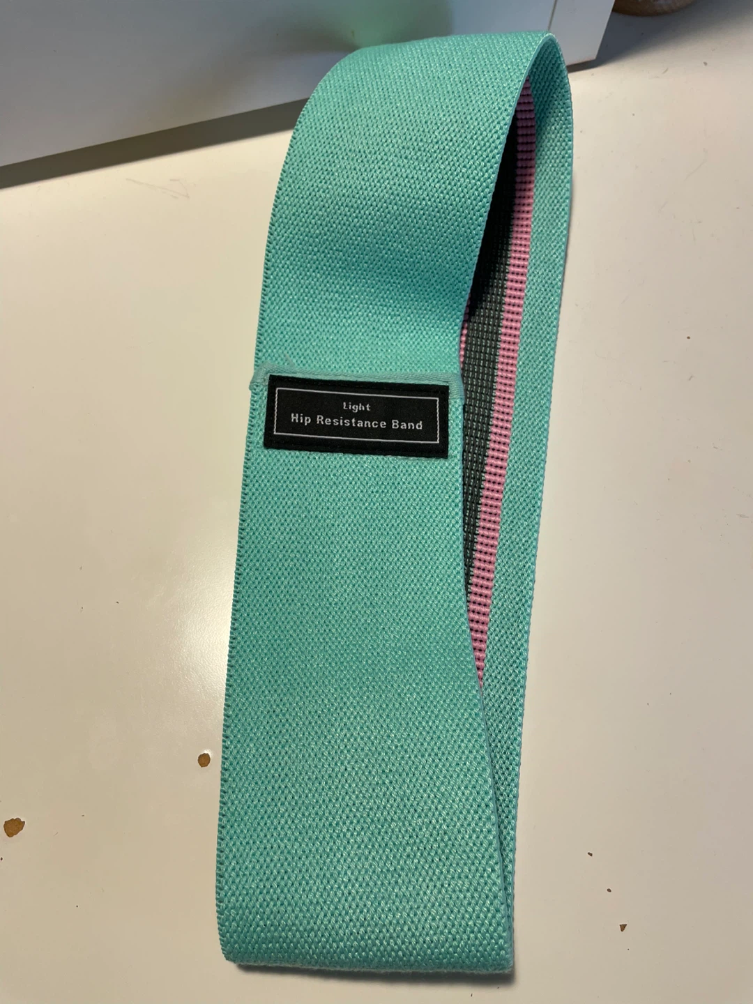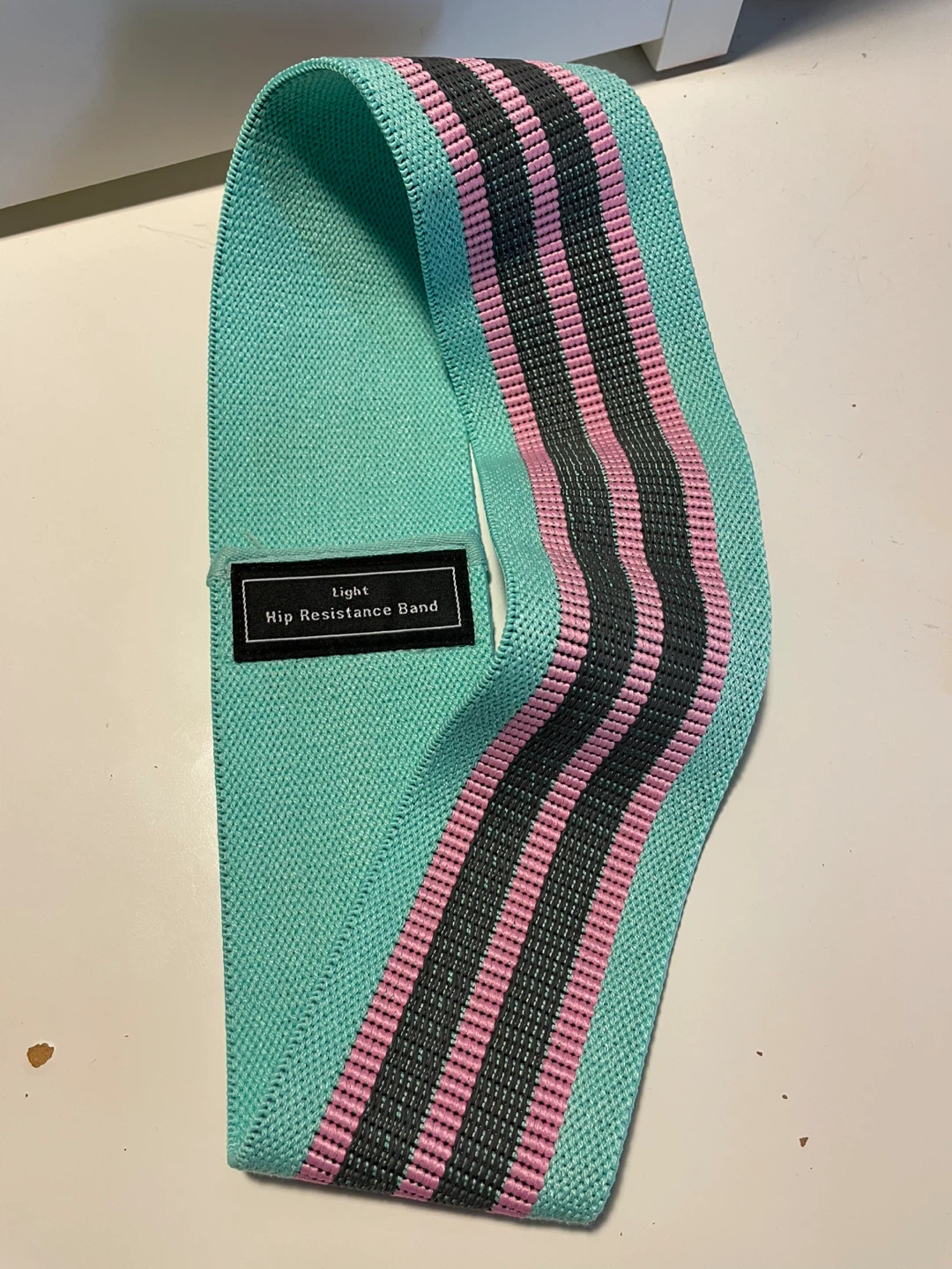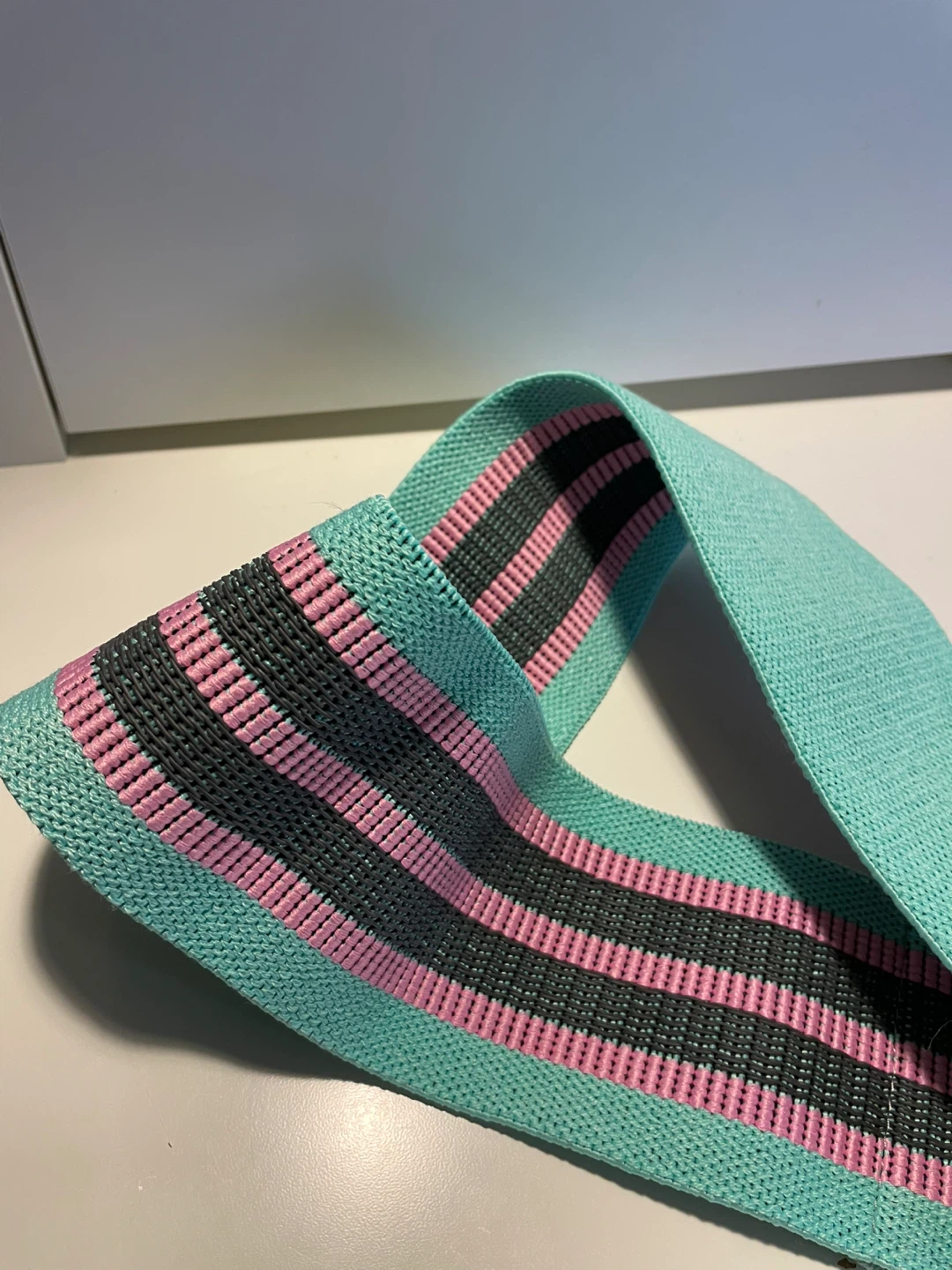 Here's a light hip resistance band in a minty colour with pink and black stripes! Perfect for your workout routine and easy to carry around