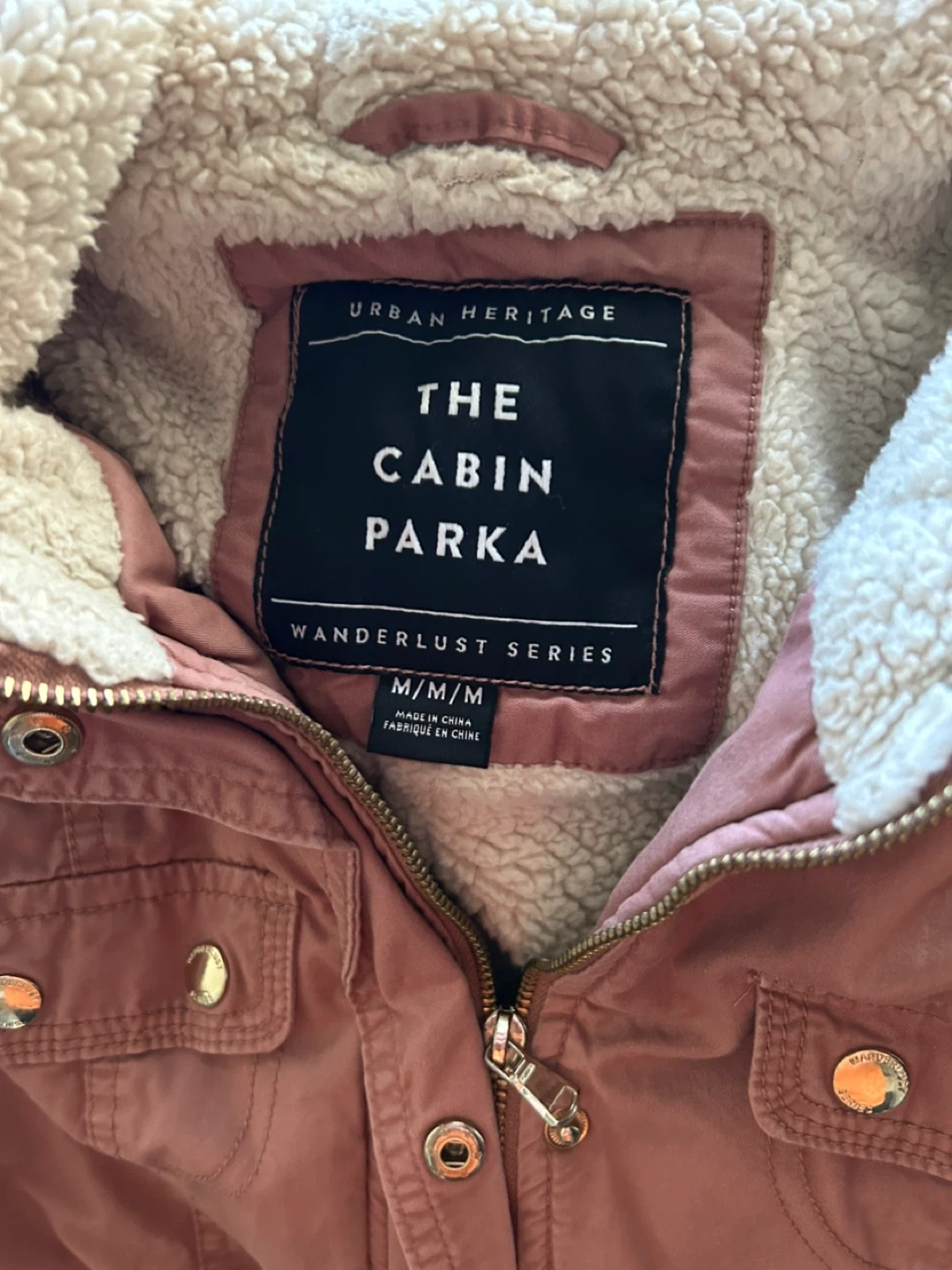 Selling an Urban Heritage 'The Cabin Parka' in size medium. It's a beautiful jacket with a cozy sherpa-lined hood and a drawstring waist for a flattering fit. The colour is a lovely muted mauve/rose tone. Perfect for those chilly Canadian days!