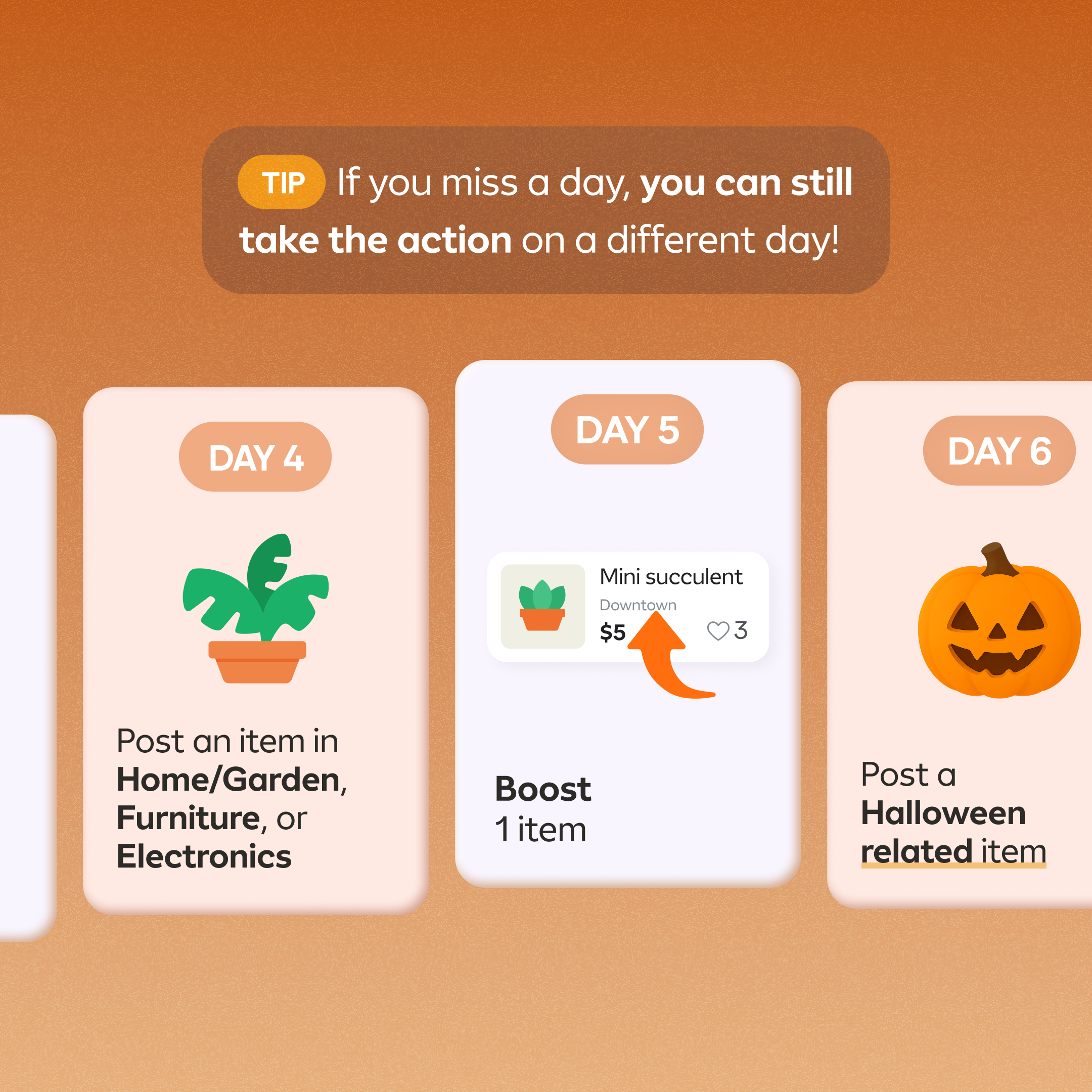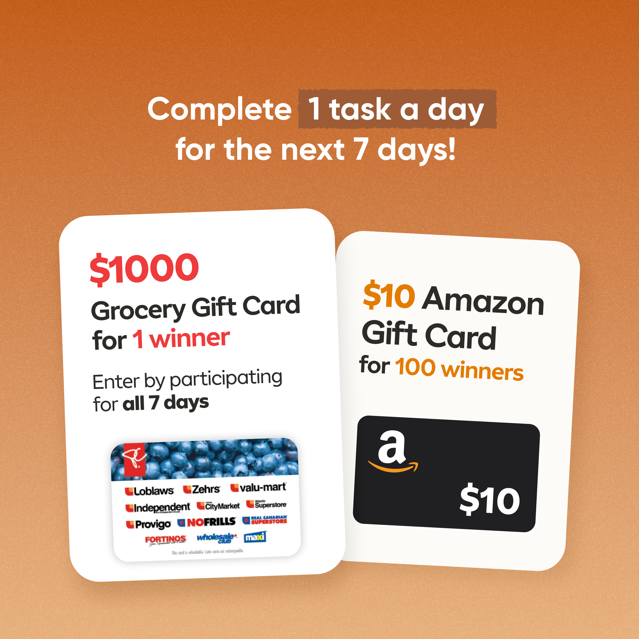 1000+Hey Karroters, Join us for our Fall Declutter Challenge! This week, we’re making your spring decluttering simple and stress-free. Complete 1 task a day for 7 days for a chance to win a $1000 Grocery Gift Card! When: October 14 - 20 PRIZES: 💸 $1000 Grocery Gift Card for 1 winner - Enter by participating for all 7 days 💸 $10 Amazon Gift Card for 100 winners - Enter by participating for at least 1 of the days 🥕🥕🥕 TIP: If you miss a day you can still post on a different day! For example, if you choose to complete all 7 days on the last day you will still be counted for the draw! 🥕🥕🥕 HOW IT WORKS: **Post items with the 🥕 emoji in the title of your listings ** Day 1 - Favourite an item Day 2 - Post an item for $20 or less Day 3 - Add a search alert (TIP: search for any item and you will see a button at the bottom of the search feed that says "Set Alert") Day 4 - Post an item in the Furniture, Home/Garden, or Electronics category Day 5 - Boost an item (TIP: Go to your "Listings" section and you will find the "Boost" button by each of your listings) Day 6 - Post a Halloween related item (costumes, decorations, craft kits etc.) Day 7 - Post something for free! 💬 You must comment below with the days you’ve participated to confirm your entry! Winners will be announced on Oct 21. Terms & Conditions - Listings must include pictures of actual items and an accurate description. - Listings must follow Karrot’s guidelines and policies. - Items listed in Karrot’s Prohibited Items will be excluded. - Promotion is only available to users in Canada.