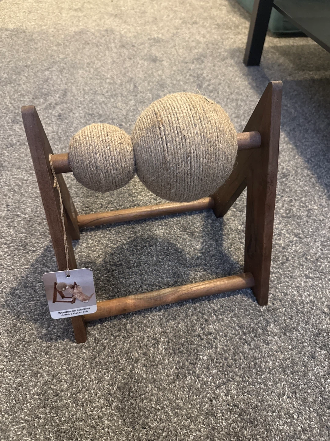 Here's a fun cat scratcher for your furry friend! It features a wooden frame and two sisal-covered balls for scratching and playing. It's in great condition and ready for a new home