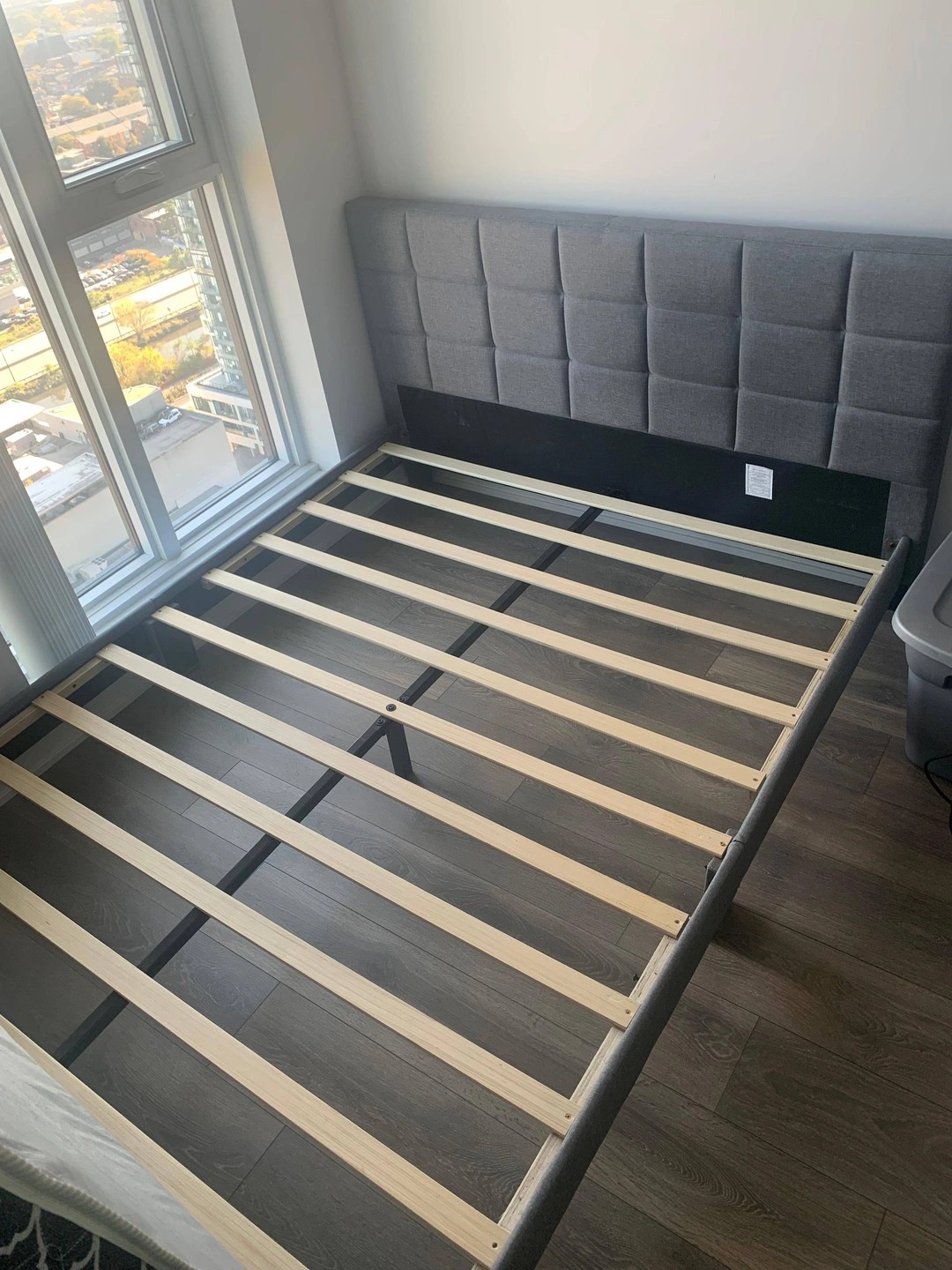 Description: Modern queen-sized bed frame with sturdy wooden slats