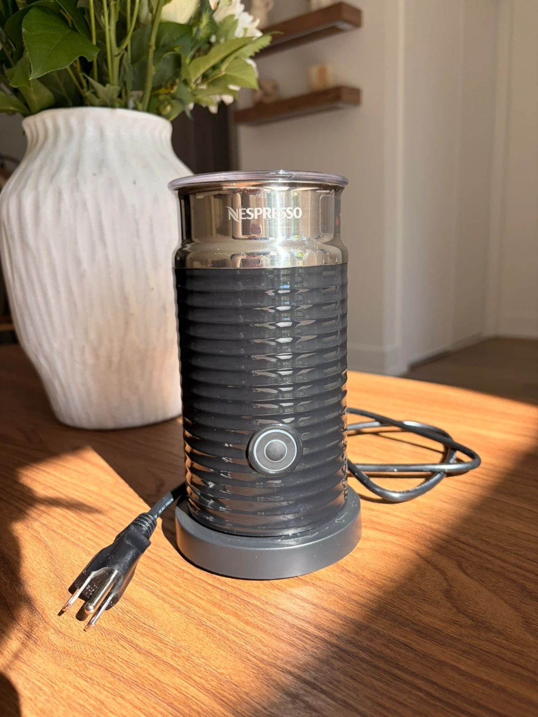 65Selling a Nespresso Aeroccino milk frother in black! It's in great condition and ready to make some delicious lattes and cappuccinos. This frother is super easy to use and clean, perfect for your morning coffee routine