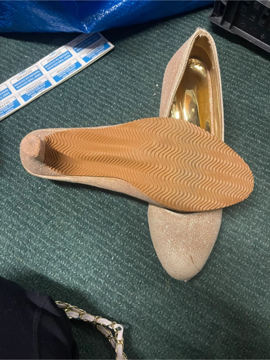 Selling a pair of glittery gold heels. They have a gold interior and a brown sole. Perfect for a night out!