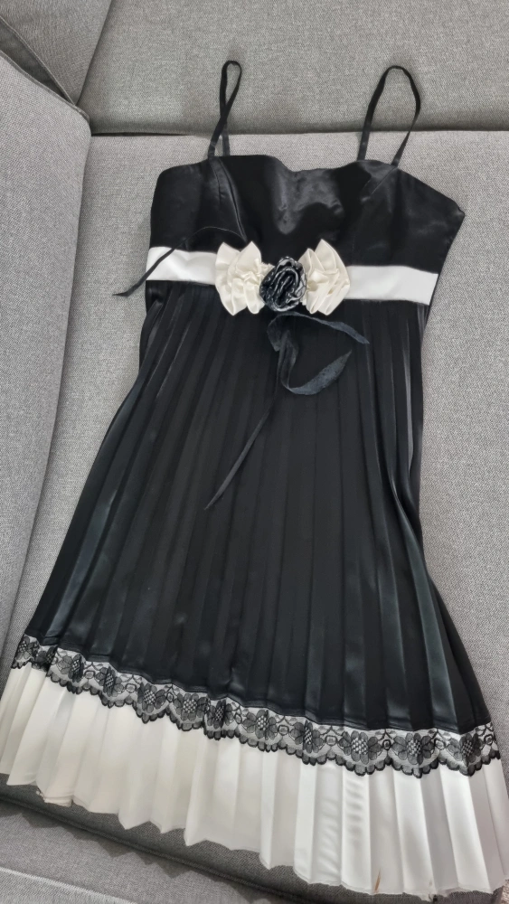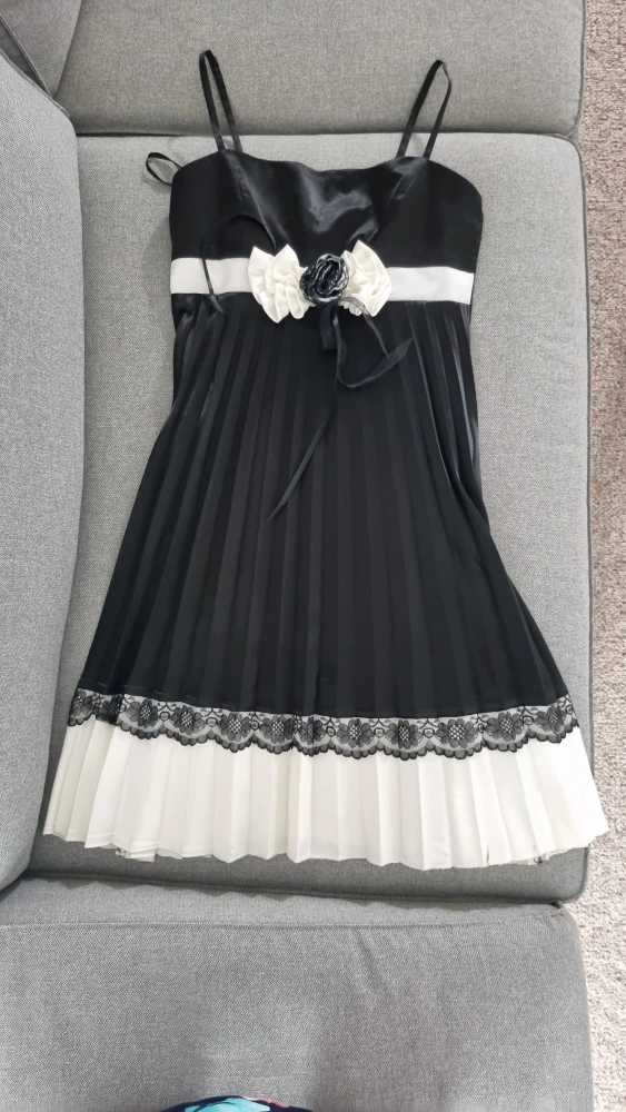 Selling a lovely black and white dress! It features a pleated skirt, a white ribbon with a floral detail, and lace trim. It's perfect for a special occasion or a night out