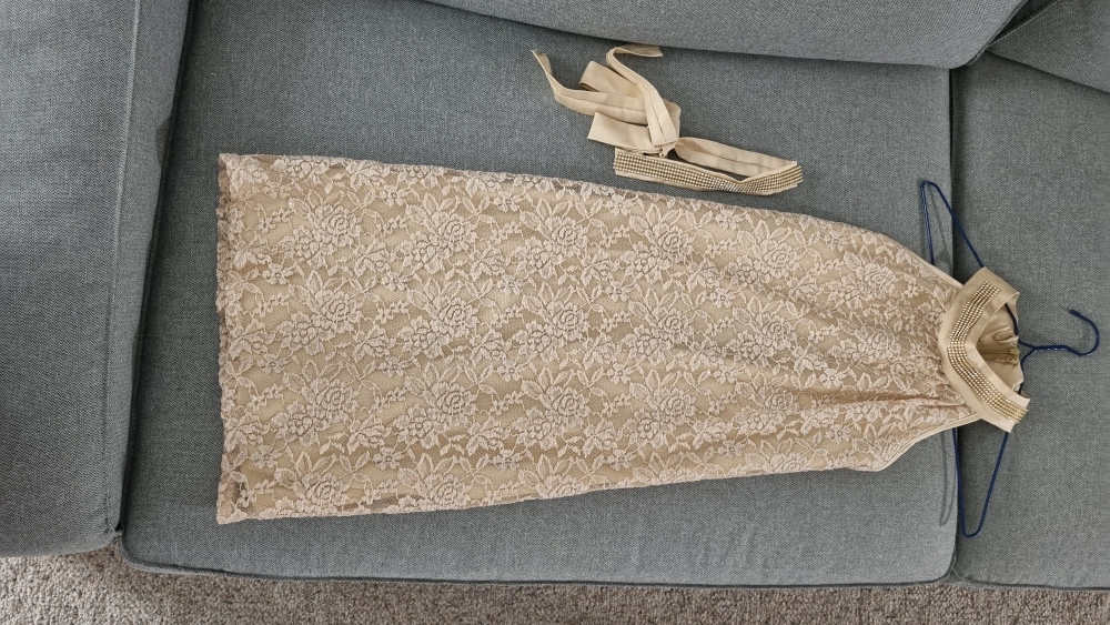 Beautiful beige lace dress! It comes with a matching belt to cinch the waist. The dress is in great condition and has a lovely floral pattern. Perfect for a special occasion or a night out!
