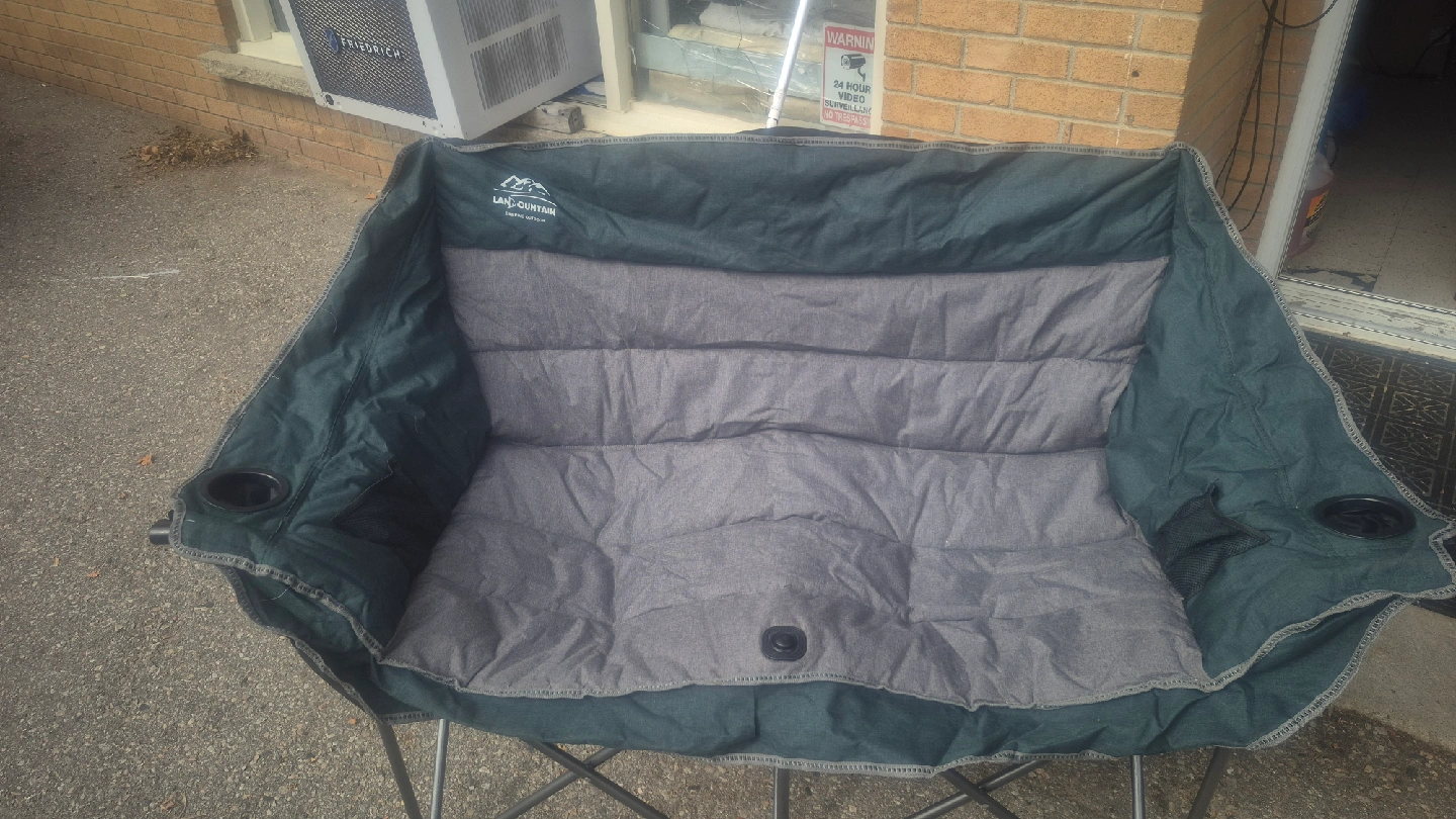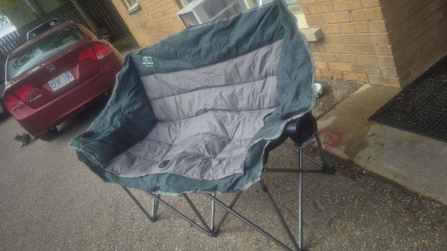 Selling a Land Mountain Camping Outdoor double chair. It's in great shape and perfect for camping or relaxing outdoors. The chair features a comfortable, padded seat and backrest, and it's easy to fold up and transport. It also has convenient cup holders on both sides