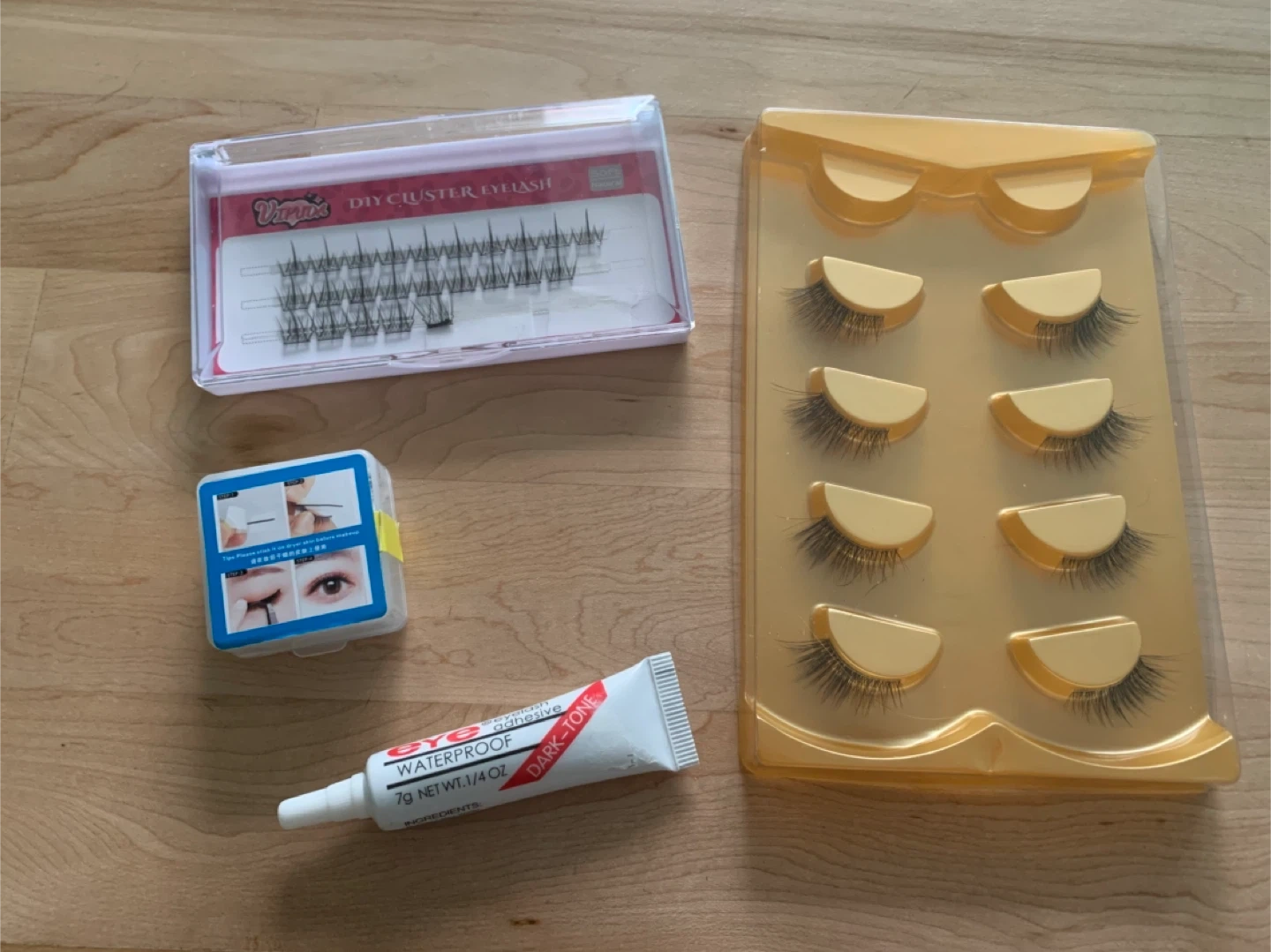 Selling a DIY cluster eyelash set. It comes with individual lashes and strip lashes. Also included is EYE waterproof eyelash adhesive in Dark-Tone, 7g.