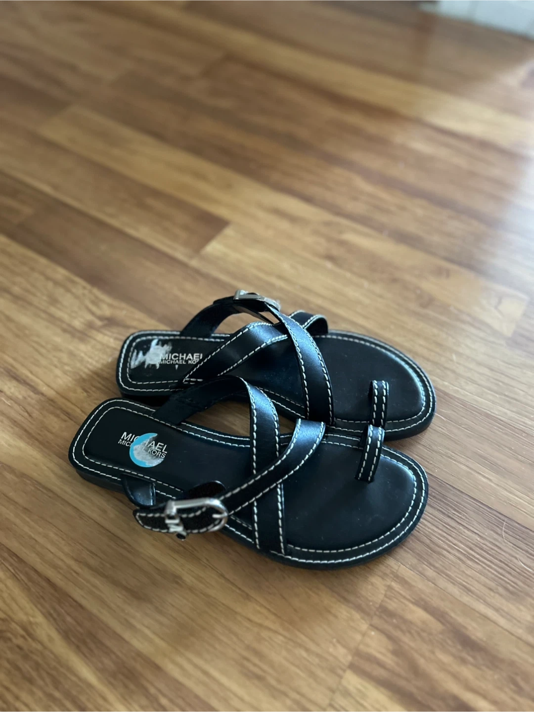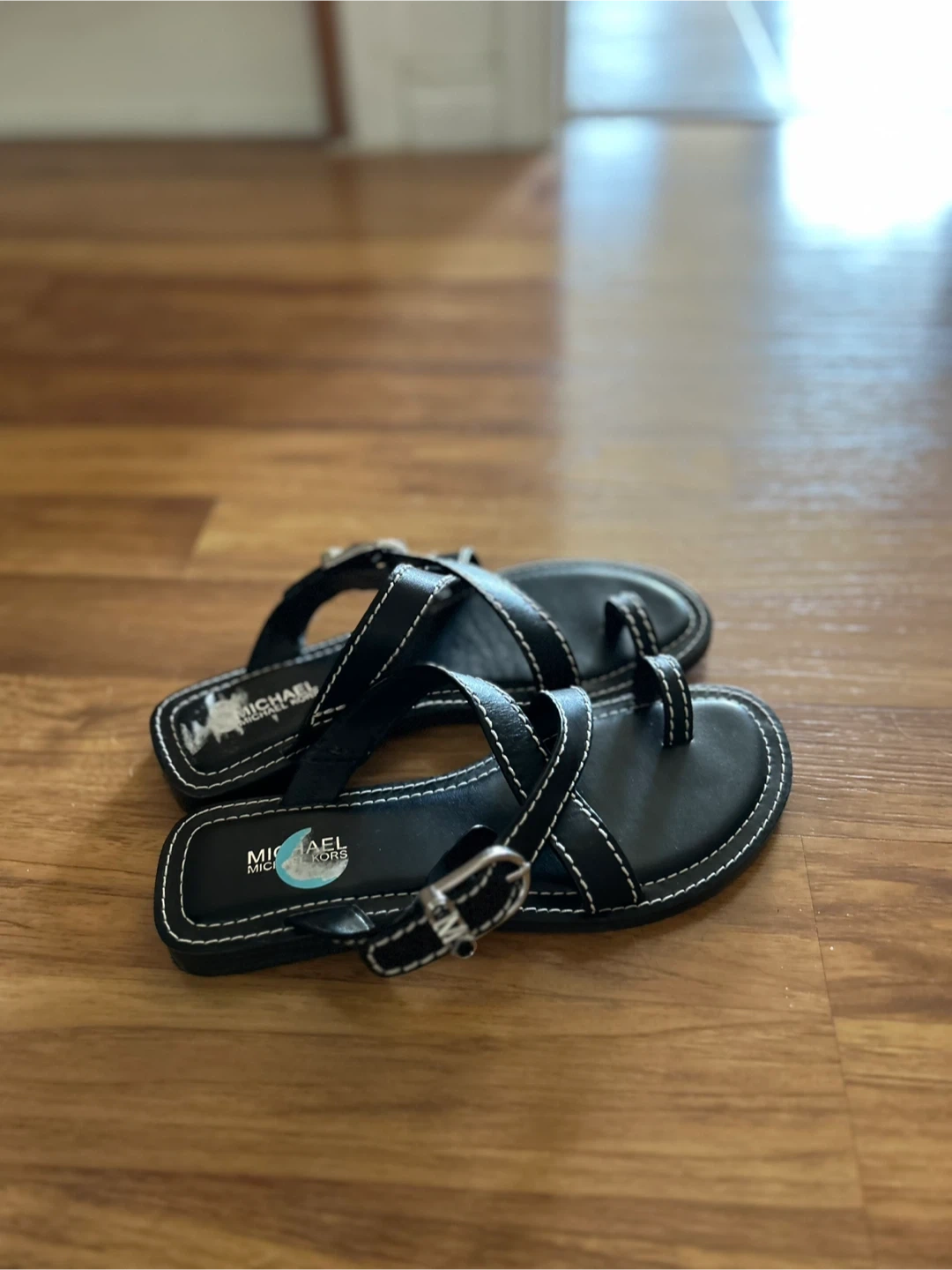 Selling a pair of Michael Kors black leather sandals in size 6M. They have a stylish design with a toe ring and buckle detail.