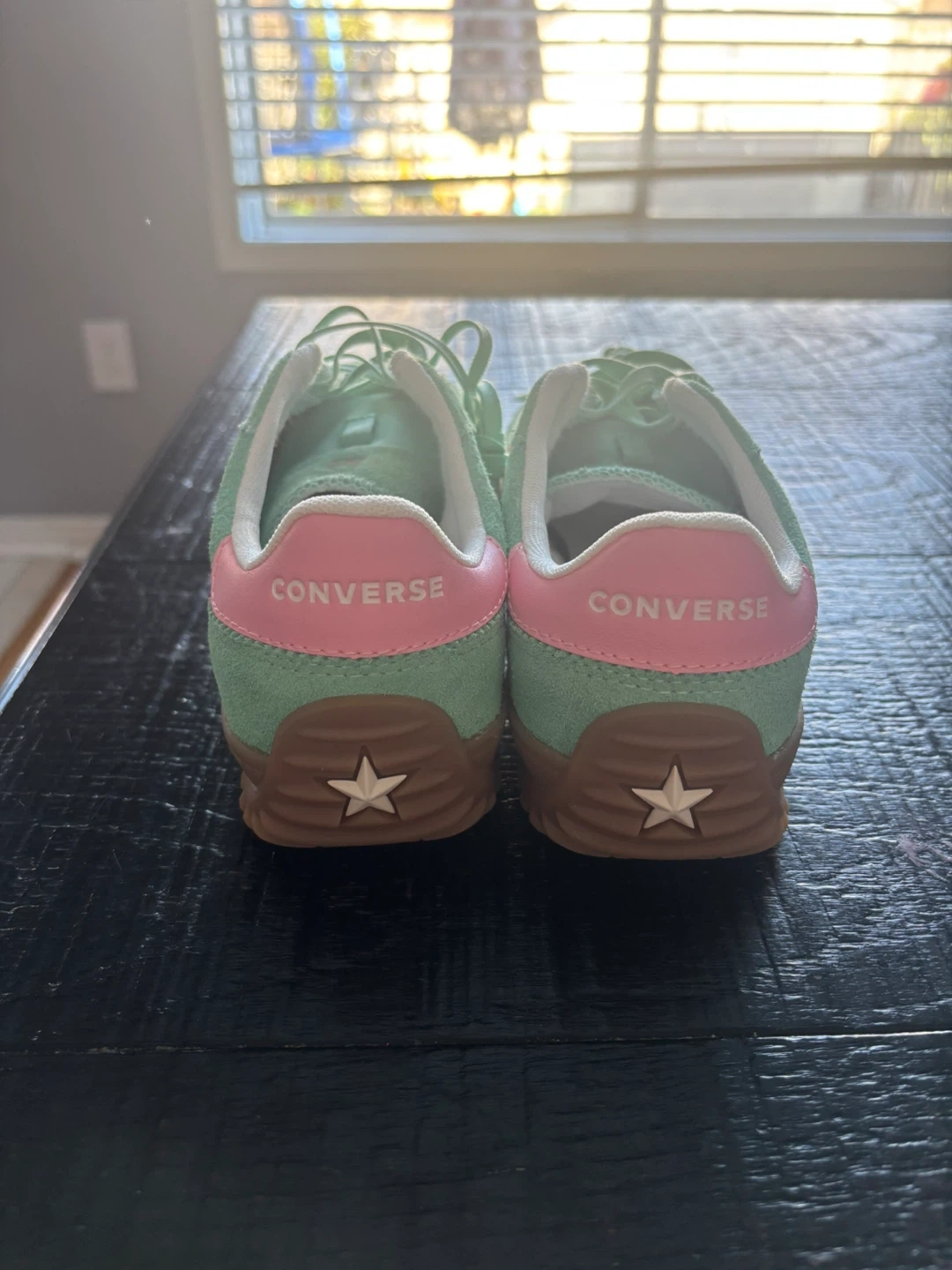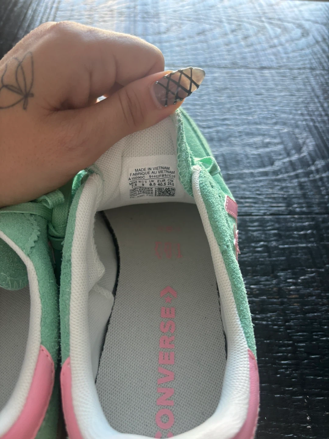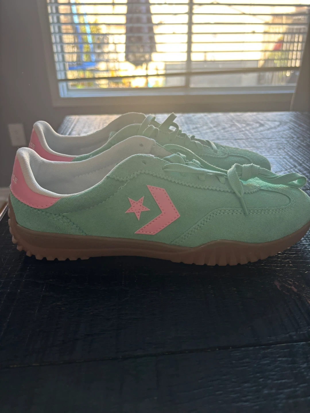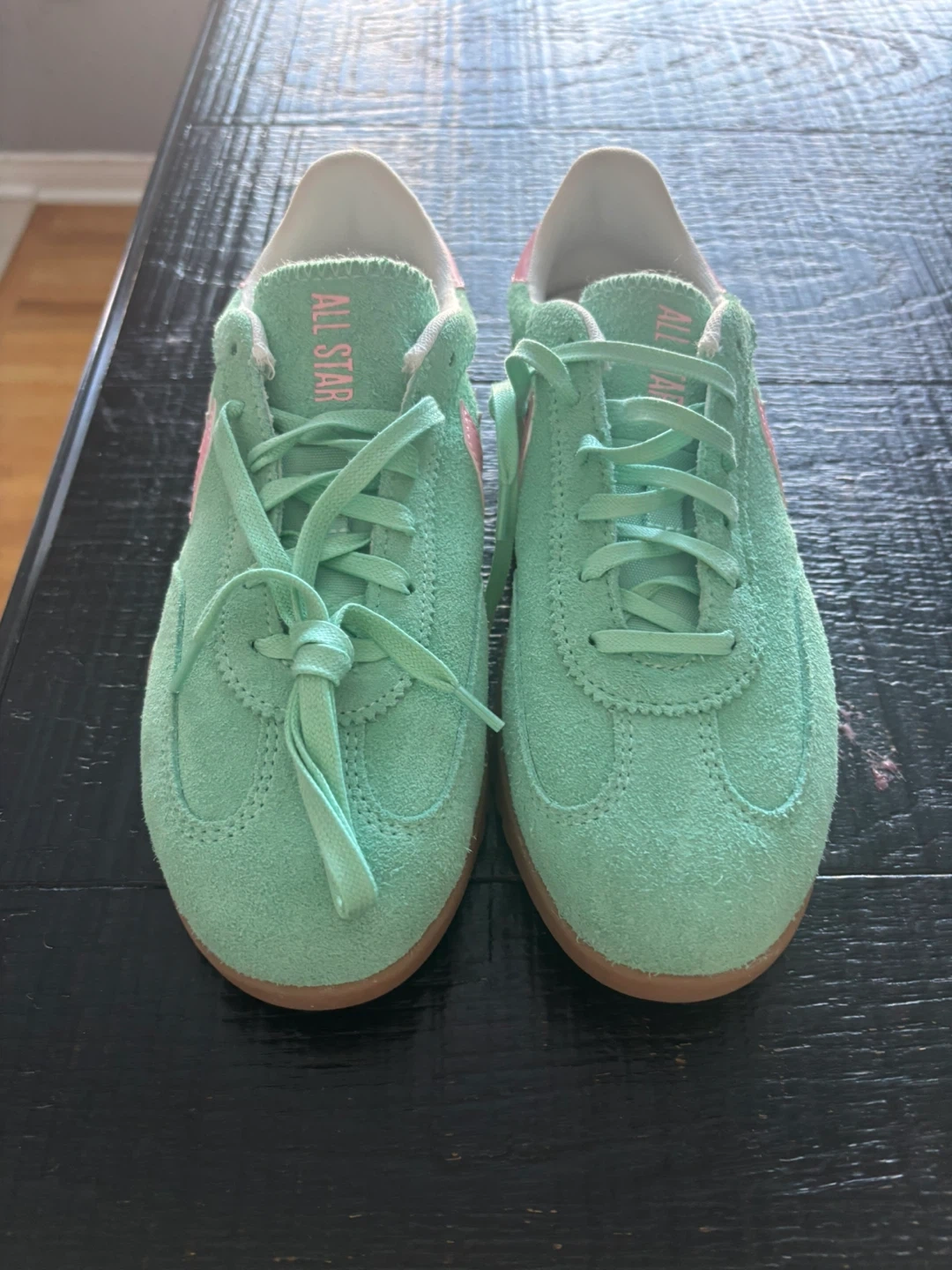 41Selling a BRAND NEW & NEW WORN pair of Converse All Star shoes in a lovely mint green colour with pink accents! They're in great condition and are a women's size 9 (US). Perfect for adding a pop of colour to your outfit!