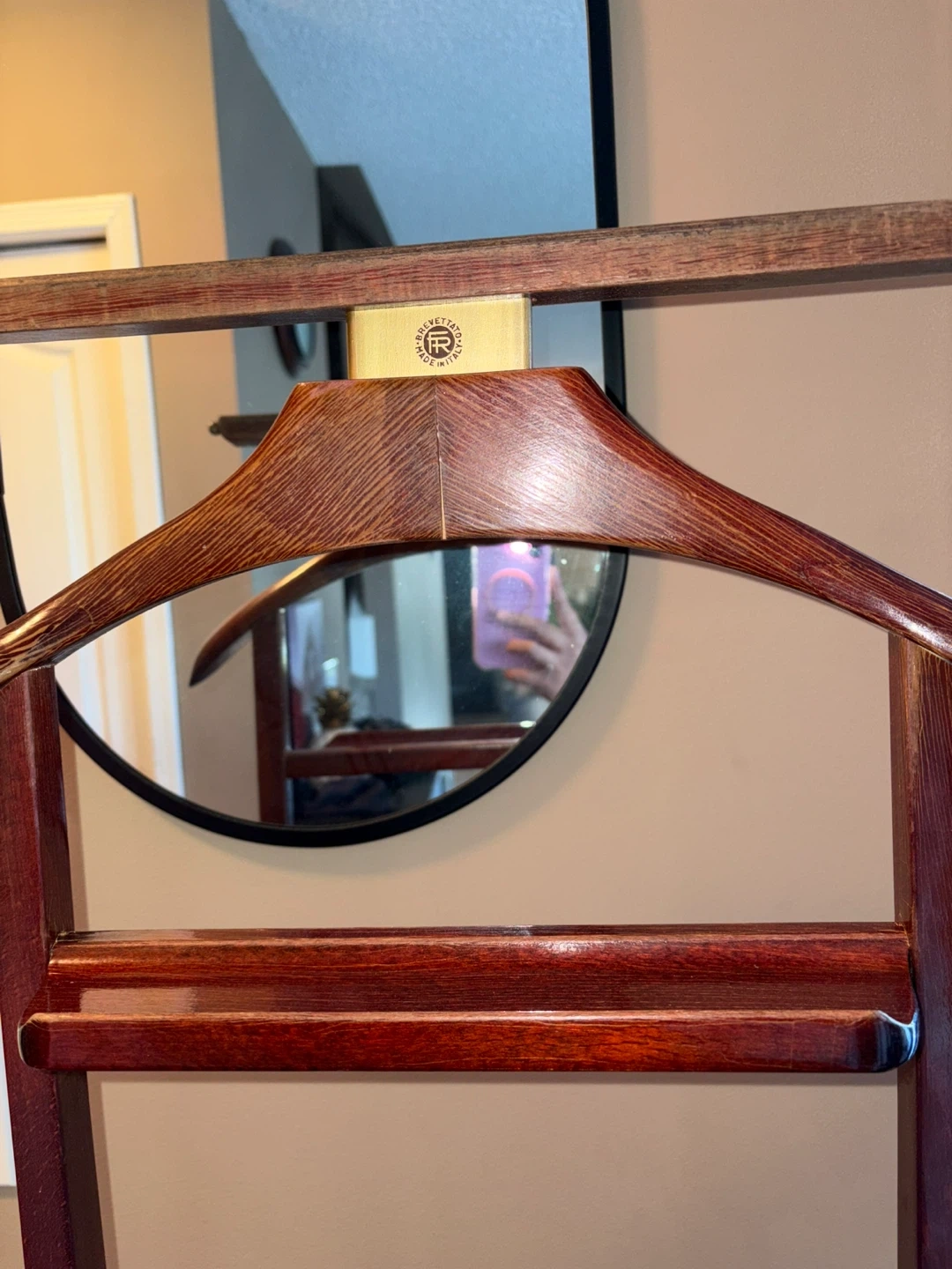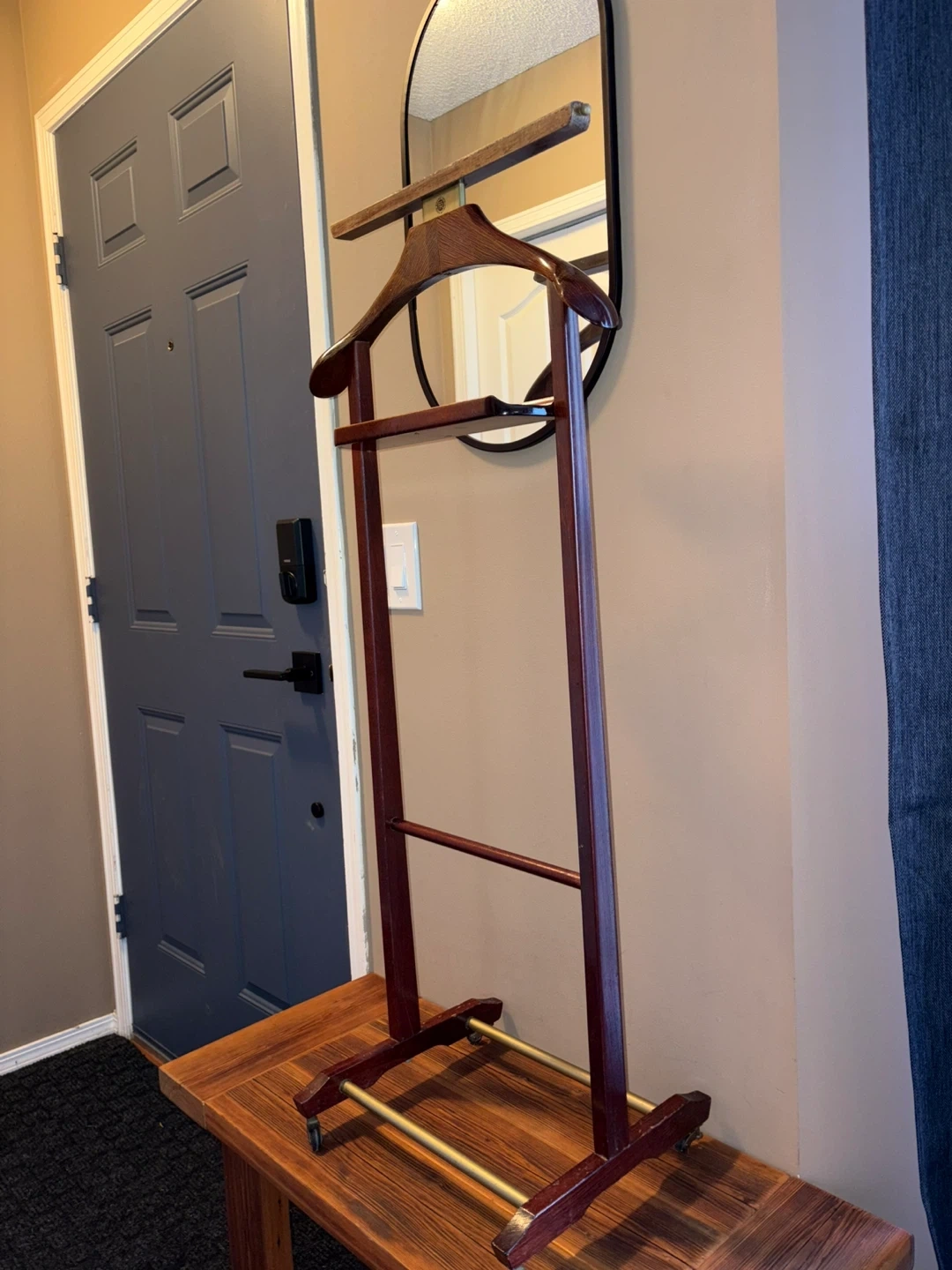 This is a lovely valet stand, perfect for keeping your clothes organized and wrinkle-free! It's got a classic design with a rich wood finish and brass accents. Great for any bedroom or dressing room