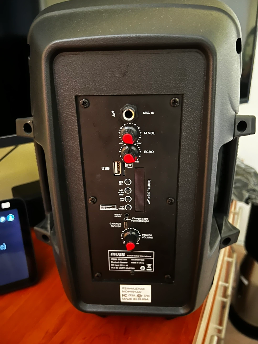 87Selling a MUZE MUZ7005 Bluetooth speaker. It comes with a microphone and has a power/volume knob. Great for parties or karaoke nights!