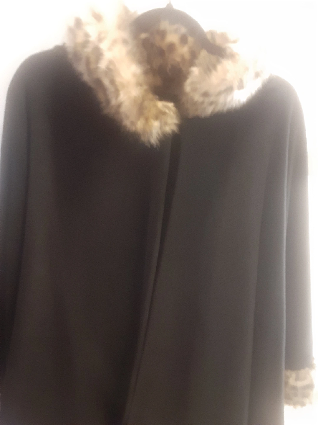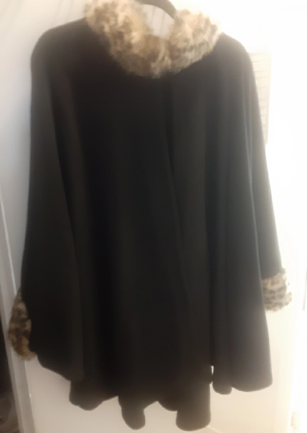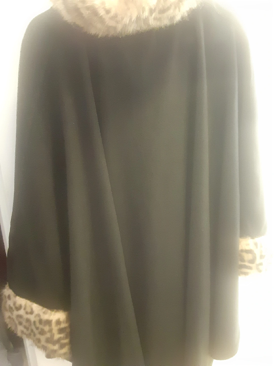 This is a Jessica brand cape in black. It is one size and made of 100% polyester. It features an animal print trim on the collar and cuffs. Perfect for adding a touch of style to any outfit!