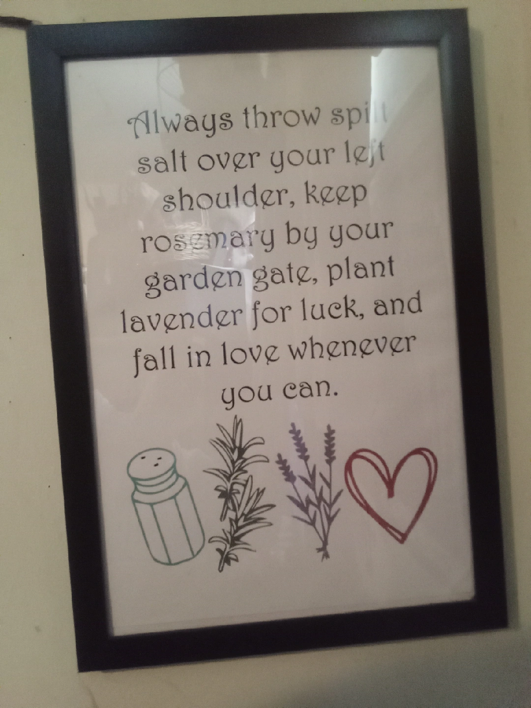practical magic quote.Cute framed print with a saying about luck and love! Features illustrated salt shaker, rosemary, lavender, and a heart. Perfect for adding a bit of charm to any room