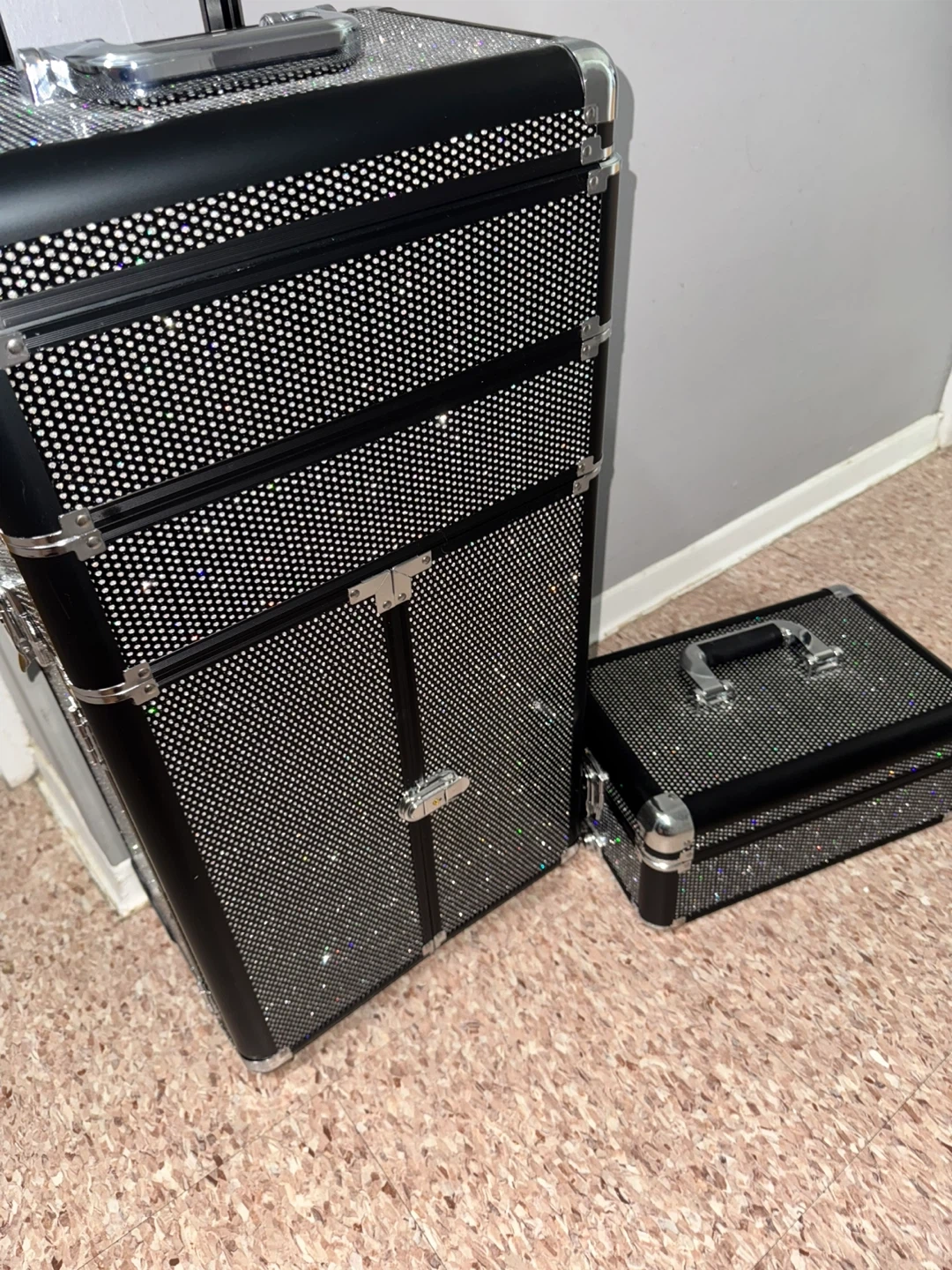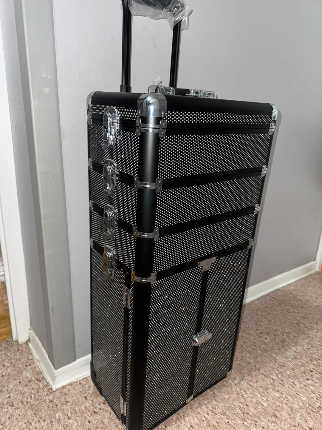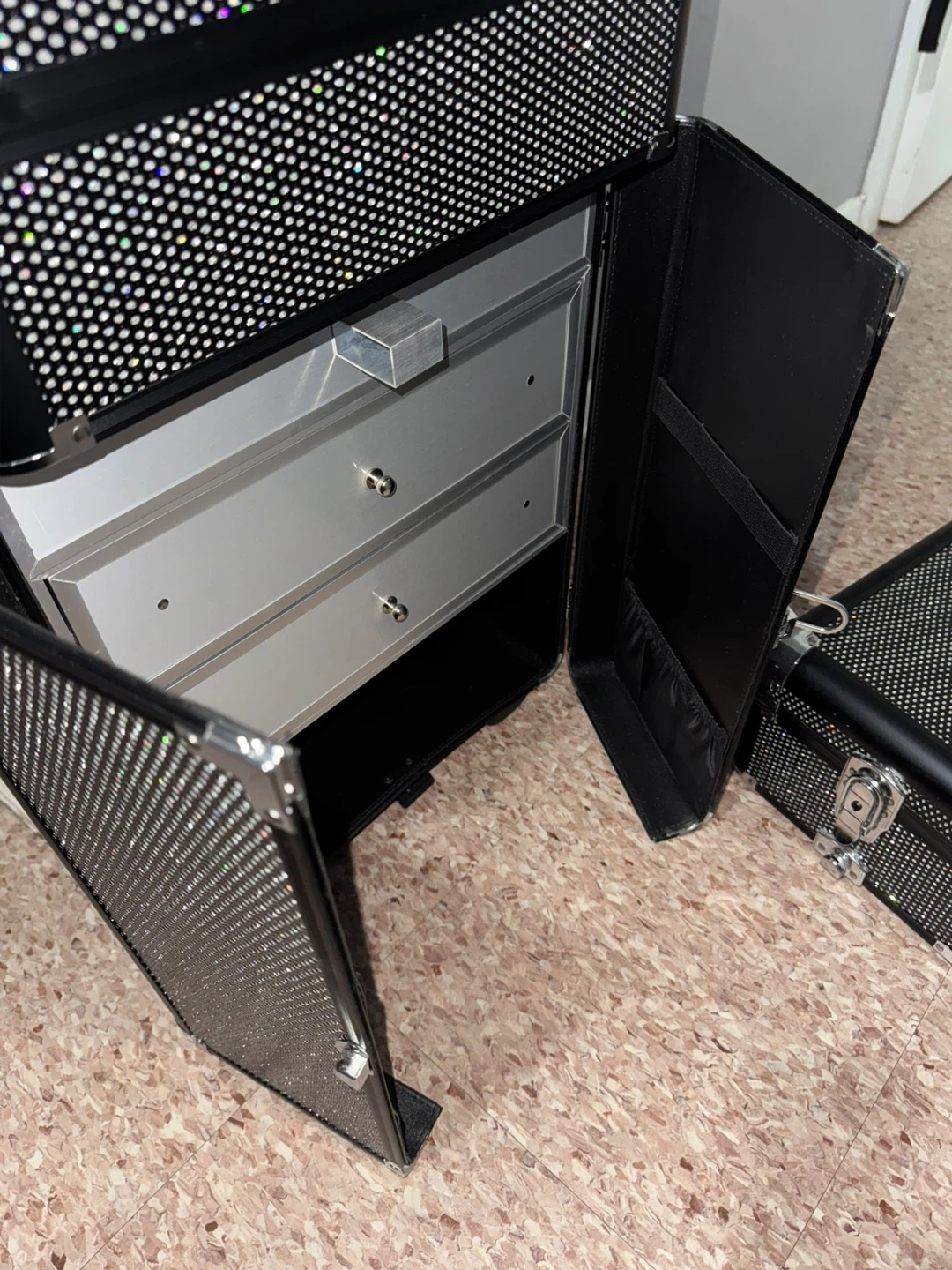 Selling a BRAND NEW rolling makeup organizer case! It's black and has multiple tiers, perfect for storing all your makeup, hair products, or other beauty supplies. It has a handle and wheels, making it easy to move around. It also has a mirror on the inside of the top compartment