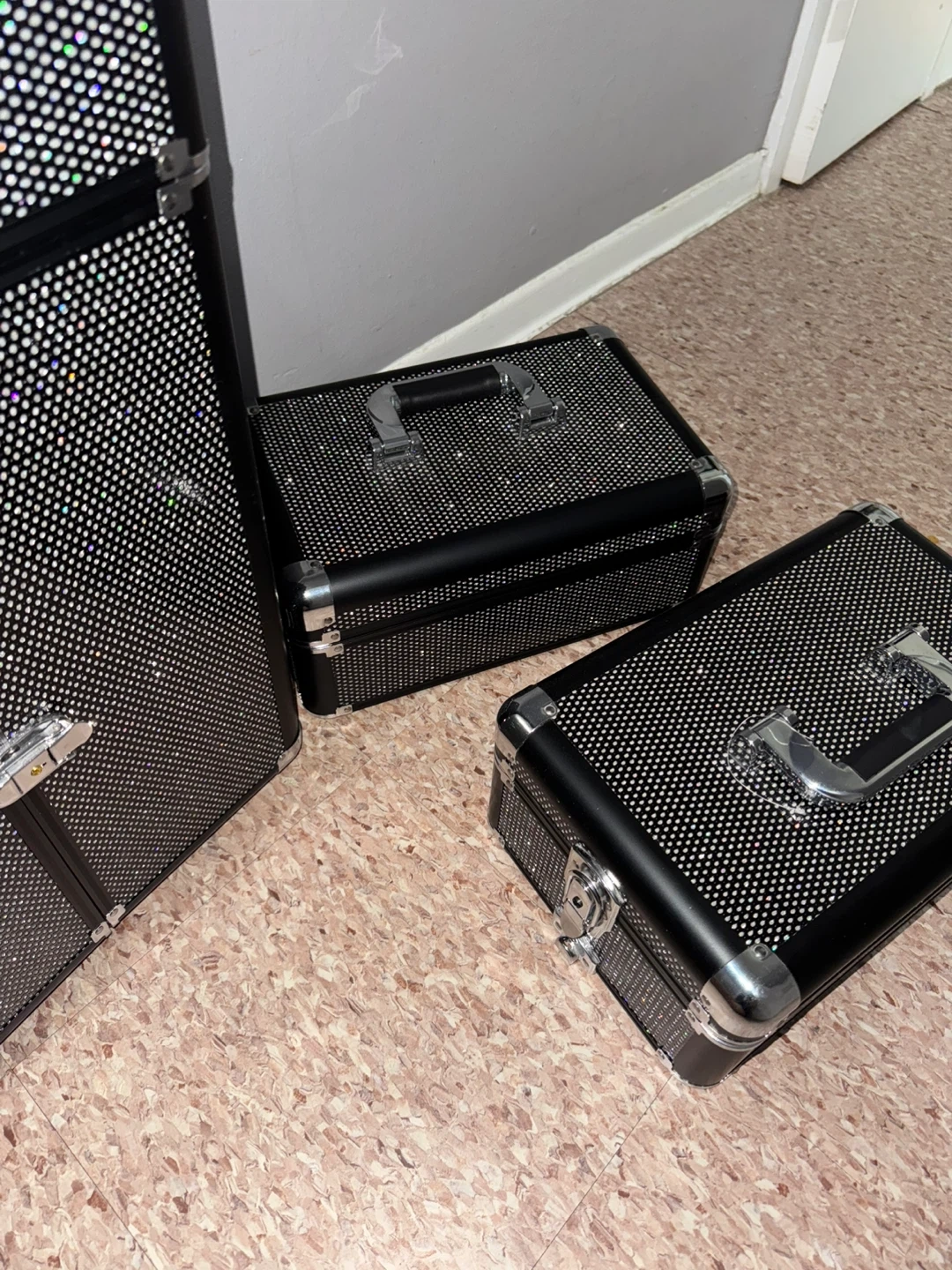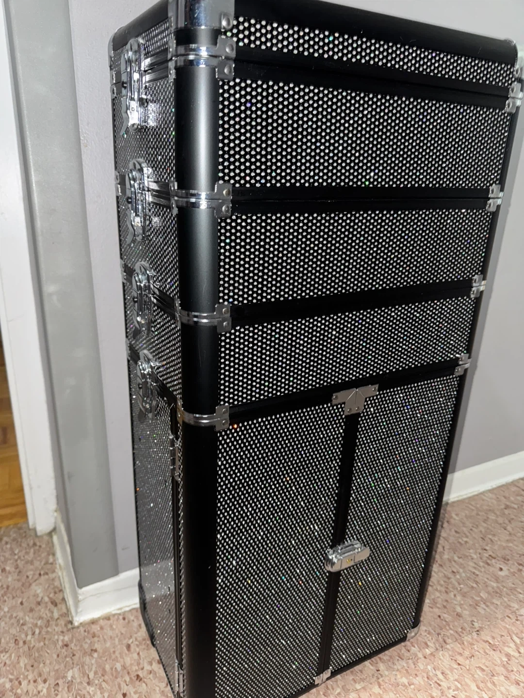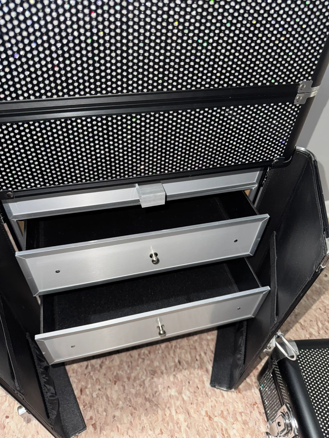 Selling a BRAND NEW rolling makeup organizer case! It's black and has multiple tiers, perfect for storing all your makeup, hair products, or other beauty supplies. It has a handle and wheels, making it easy to move around. It also has a mirror on the inside of the top compartment