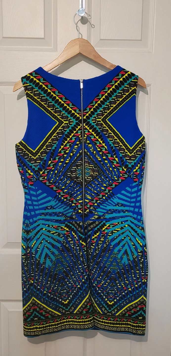 This is a Peter Nygard Petite dress with a vibrant blue and patterned design! It's perfect for adding a pop of colour to your wardrobe and is in great condition. The dress has a unique geometric pattern with hints of yellow, black, green and red, making it a standout piece.