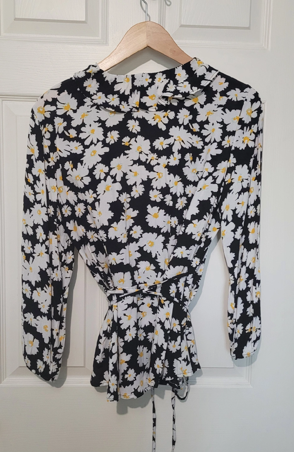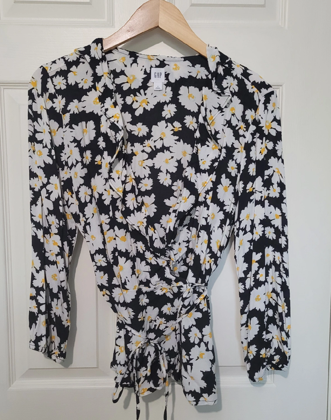 Selling a cute GAP wrap blouse with a black and white floral daisy print! It's a size medium and in great condition. This blouse features a flattering wrap style with a tie at the waist. Perfect for adding a touch of floral flair to your wardrobe.