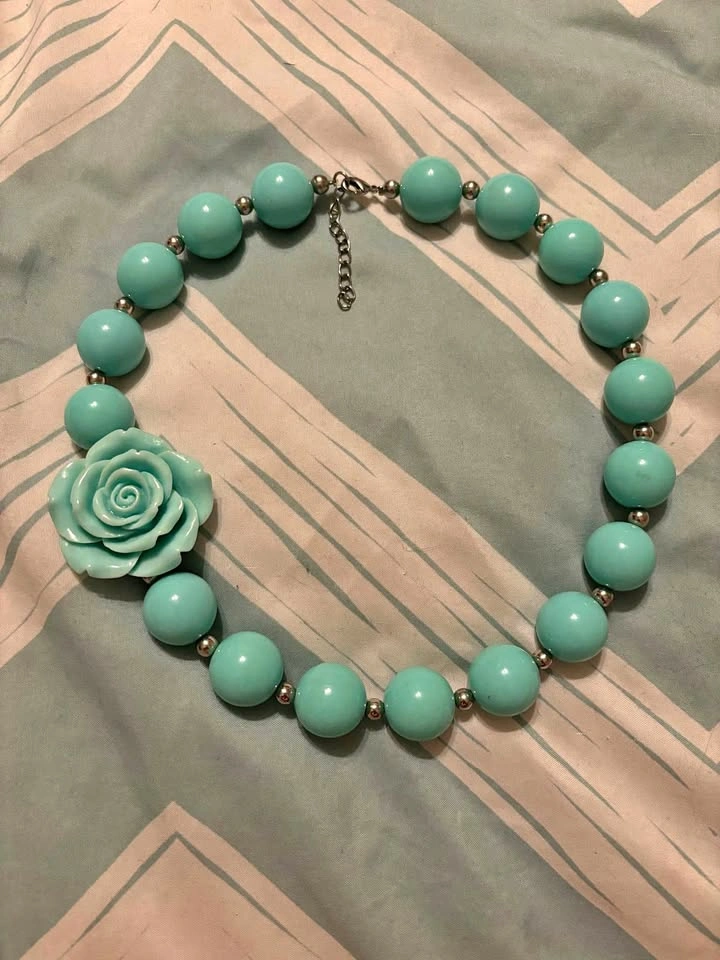 15Large statement necklace. It has large teal beads with and accent rose bead. Would be great as part of a rockabilly outfit. Pickup is in Dover using the bin system. Cash only please.
