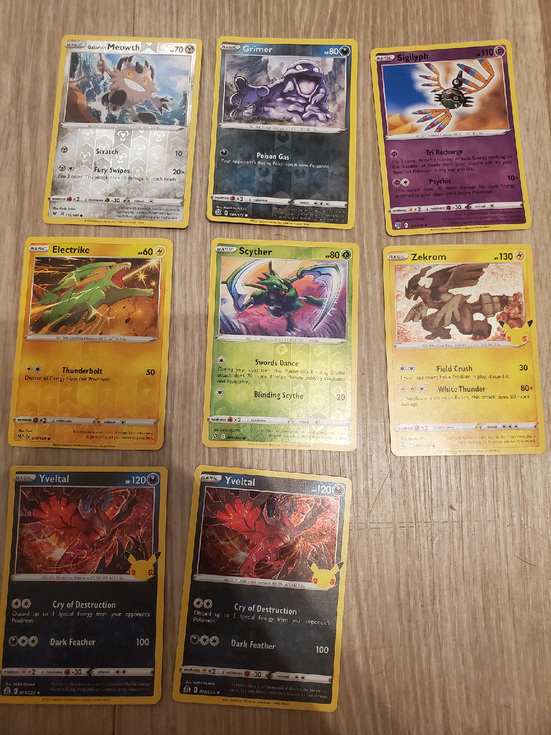 Selling a collection of assorted Pokemon cards! Includes Galarian Meowth, Grimer, Sigilyph, Electrike, Scyther, Zekrom, and 2 Yveltals. Great for collectors or anyone looking to expand their deck