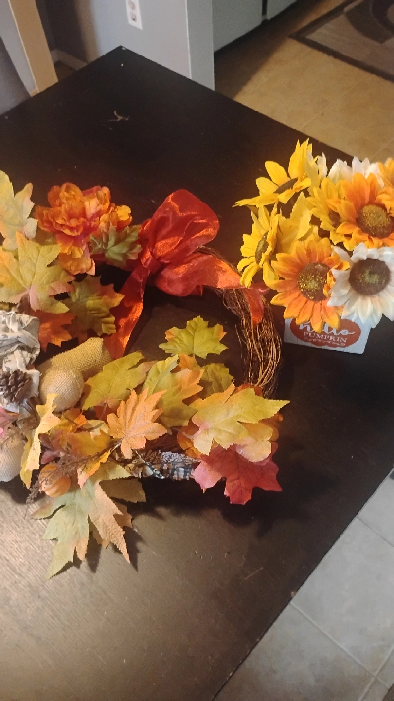 Selling a lovely fall-themed wreath and sunflower arrangement! The wreath features beautiful autumn leaves and a charming red bow. The sunflower arrangement comes in a cute "Hello Pumpkin" pot, perfect for adding a touch of seasonal cheer to your home