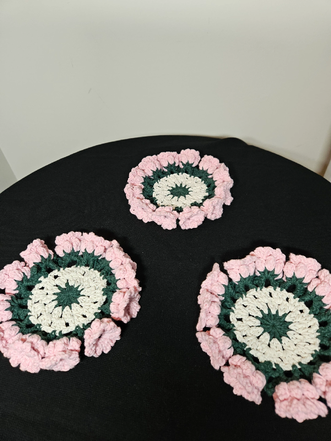 Selling a set of three carefully handmade crochet coasters. They're perfect as a gift or adding a touch of handmade charm to your coffee table or desk!