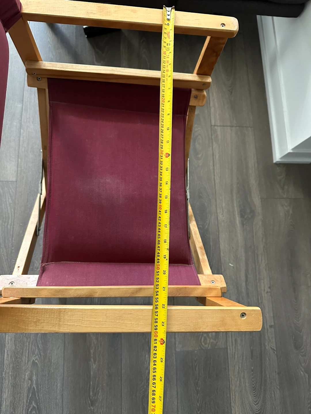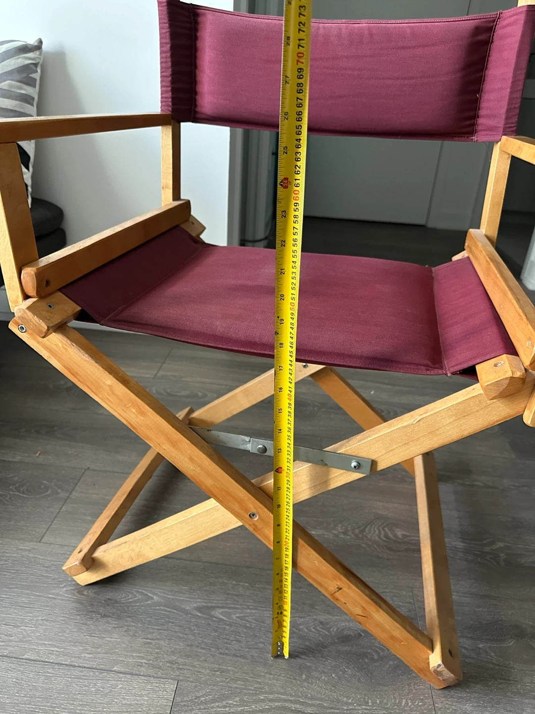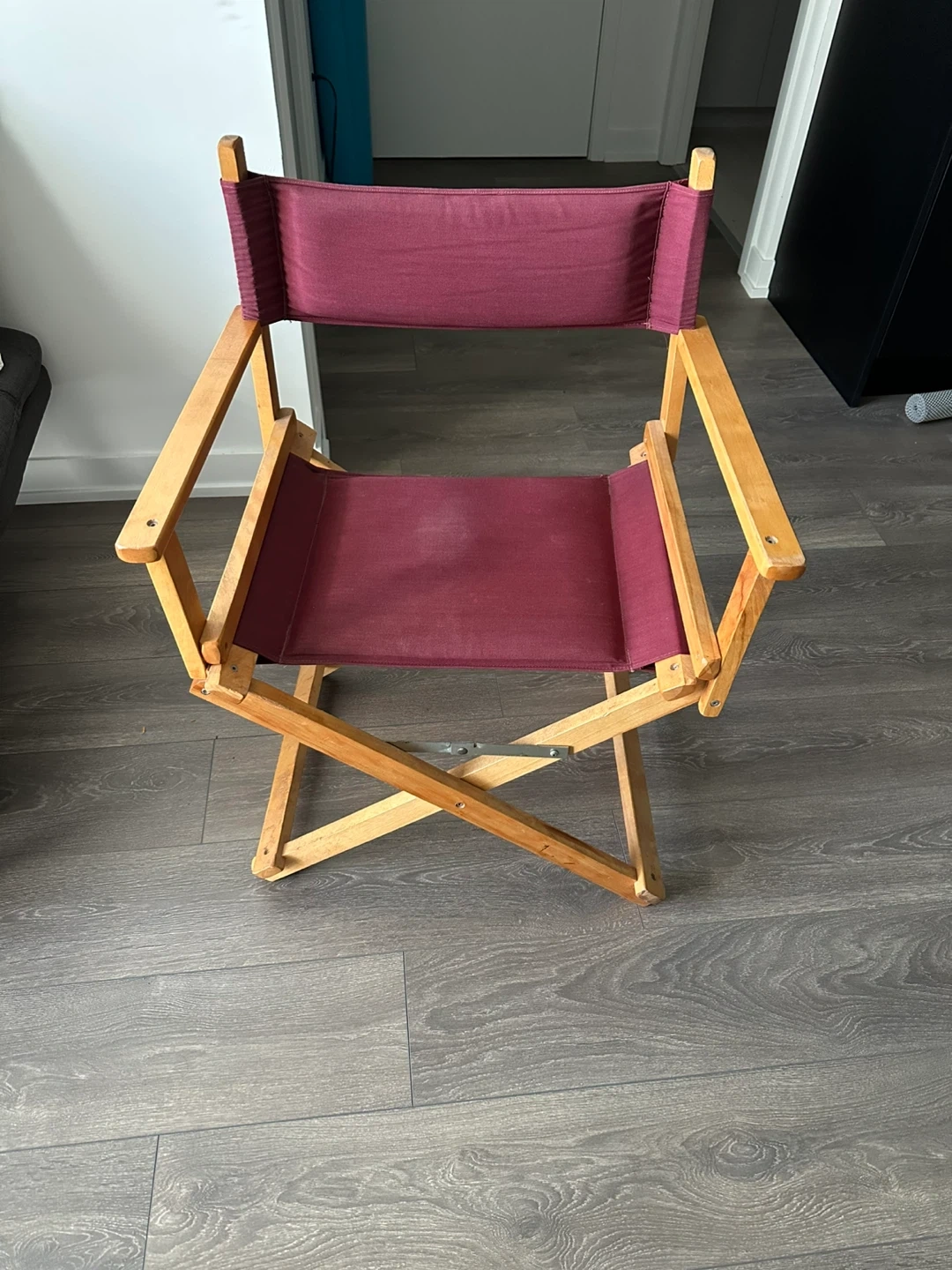 Selling a burgundy director's chair with a folding wooden frame! It's in good shape. The chair is perfect for indoor or outdoor use and folds up easily for storage. Approximate height is 31 inches, width is 22 inches and sitting height is 17 inches.