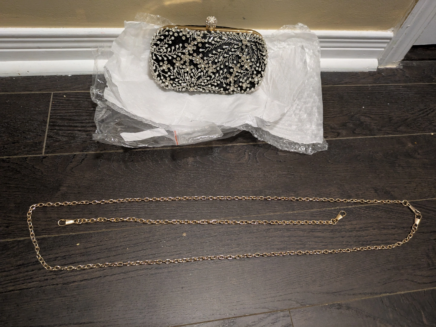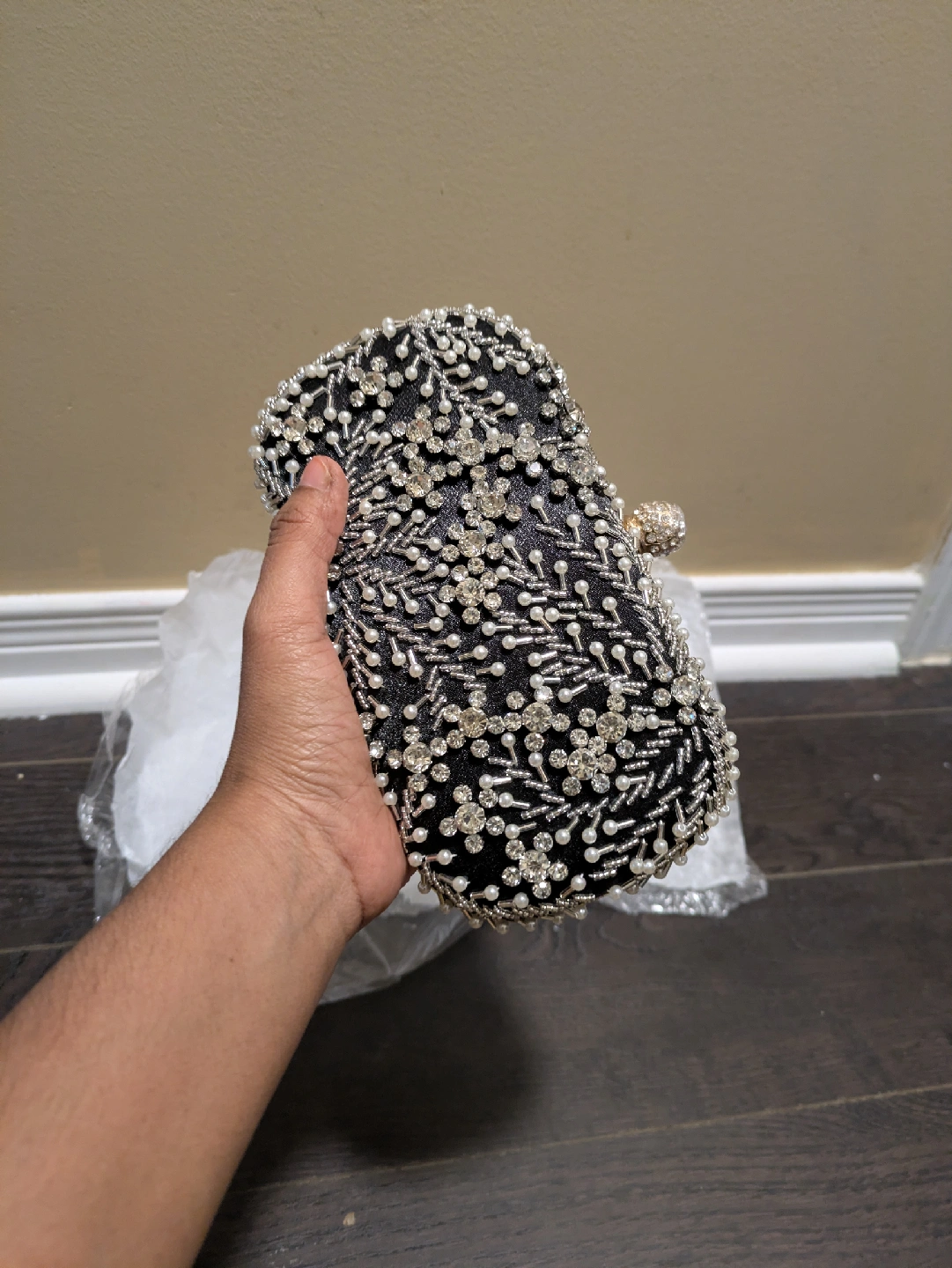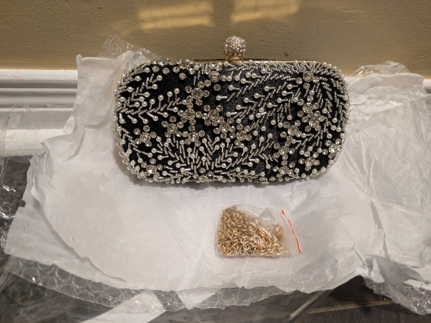 Selling a beautiful black evening clutch, perfect for special occasions! It's adorned with intricate beadwork and comes with a detachable gold chain. The approximate dimensions are 19cm x 12cm x 6cm.