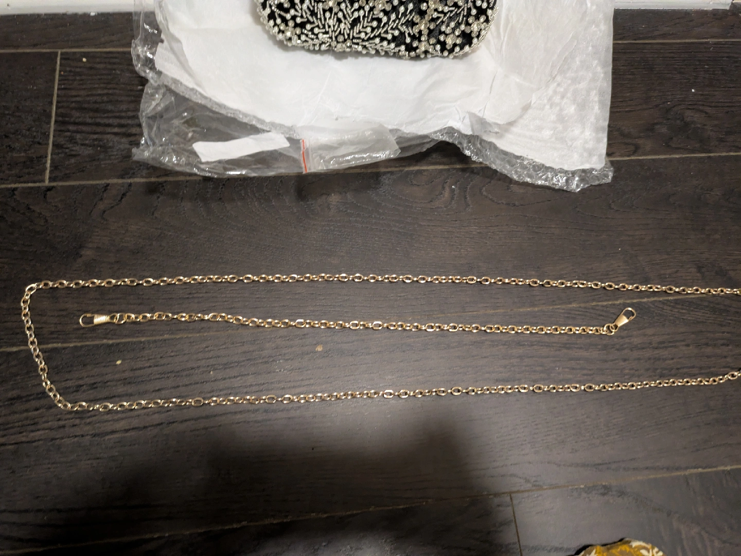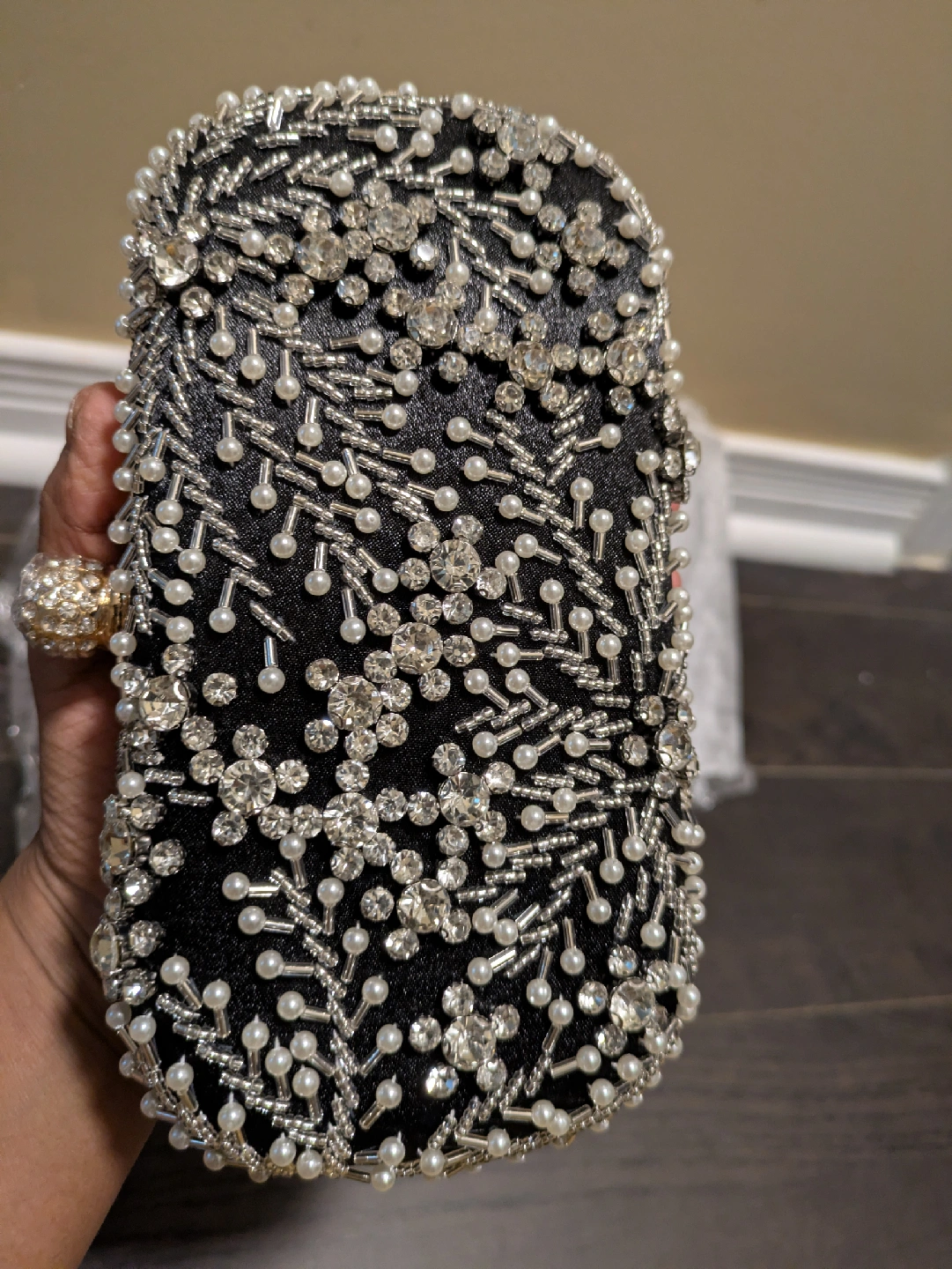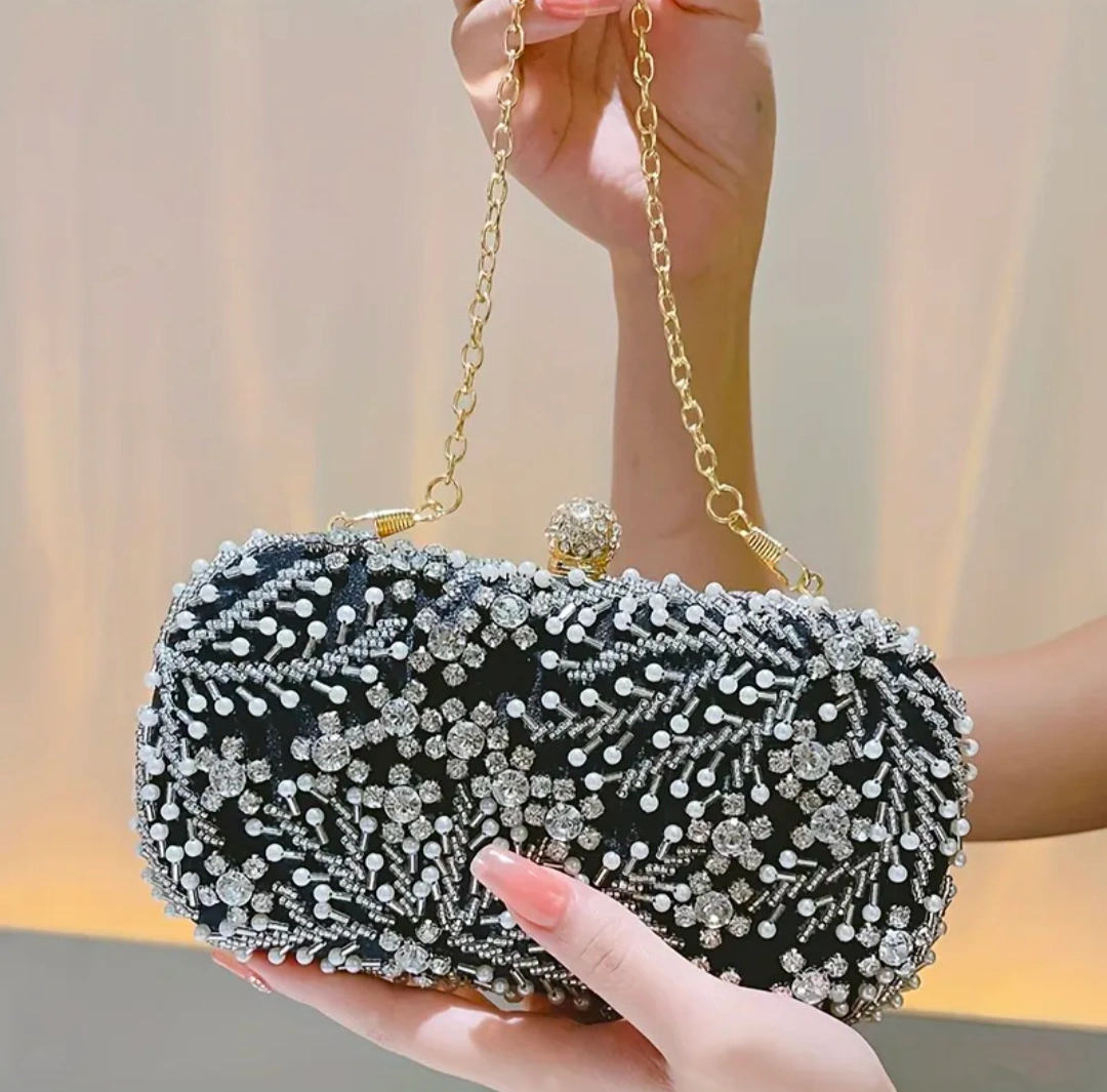 Selling a beautiful black evening clutch, perfect for special occasions! It's adorned with intricate beadwork and comes with a detachable gold chain. The approximate dimensions are 19cm x 12cm x 6cm.