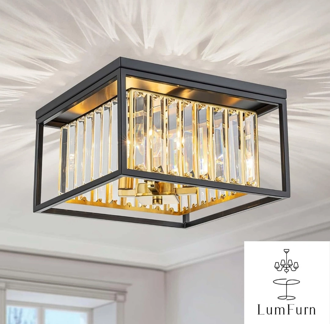 Add a touch of elegance to your home with this flush mount ceiling light fixture! It features a black frame with crystal accents, creating a modern and sophisticated look. The fixture measures approximately 11.8 inches (30cm) in diameter and 6.9 inches (17.5cm) in height. It uses E12*4 base bulbs (bulbs not included) and is compatible with dimmable bulbs and dimmer controllers