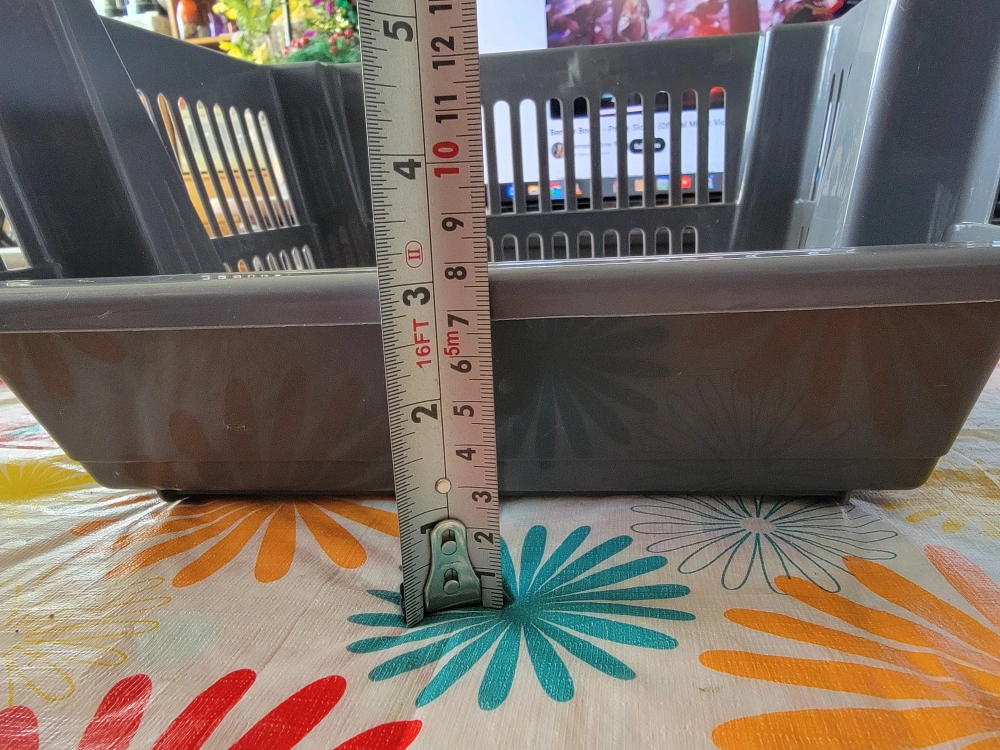 Here's a handy grey plastic storage basket! It measures approximately 12 inches in length, 10 inches in width, and 5 inches in height. Perfect for organizing various items around the house
