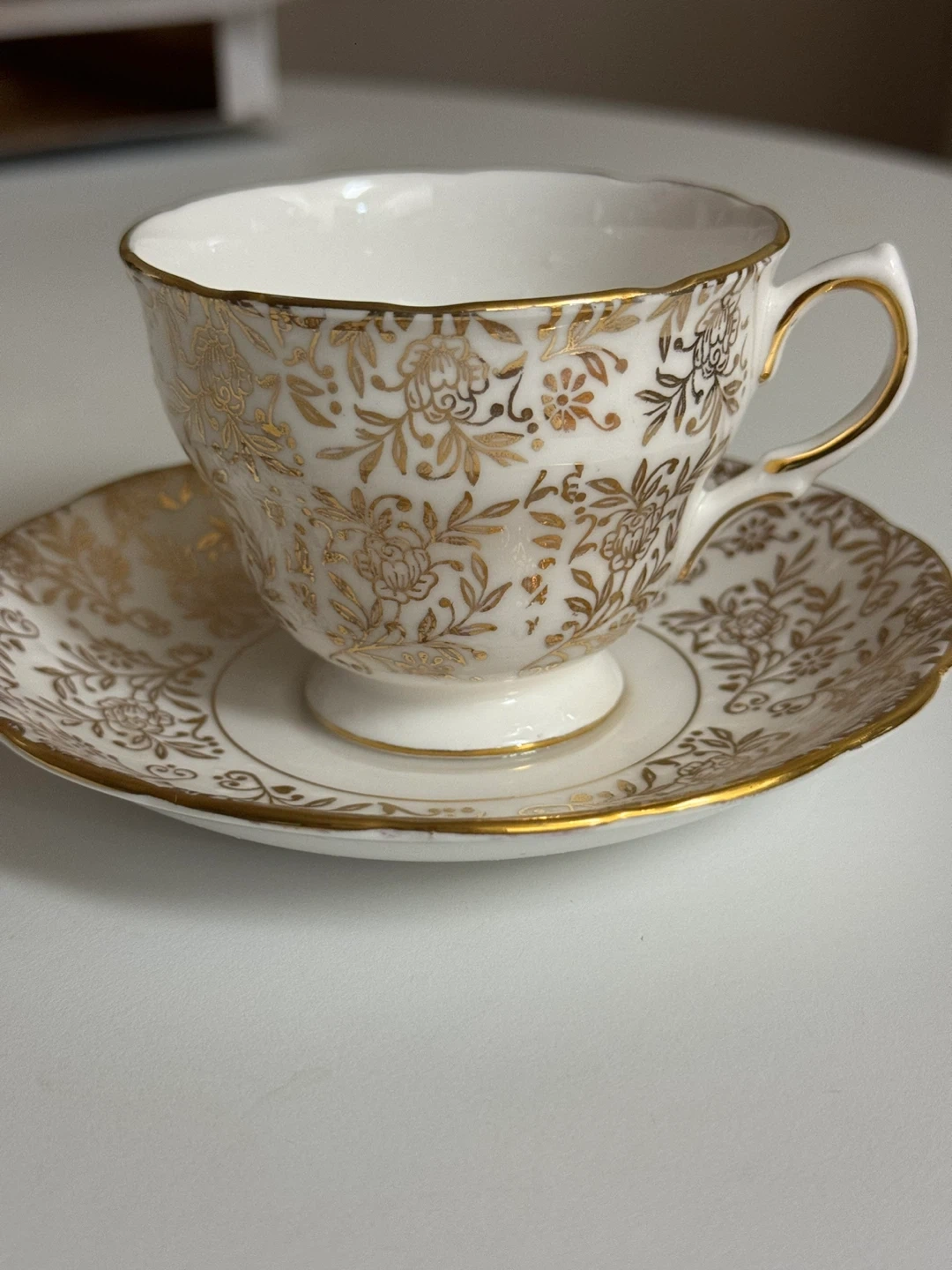 Royal Malvern bone china tea cup and saucer set, featuring a beautiful floral pattern with gold accents
