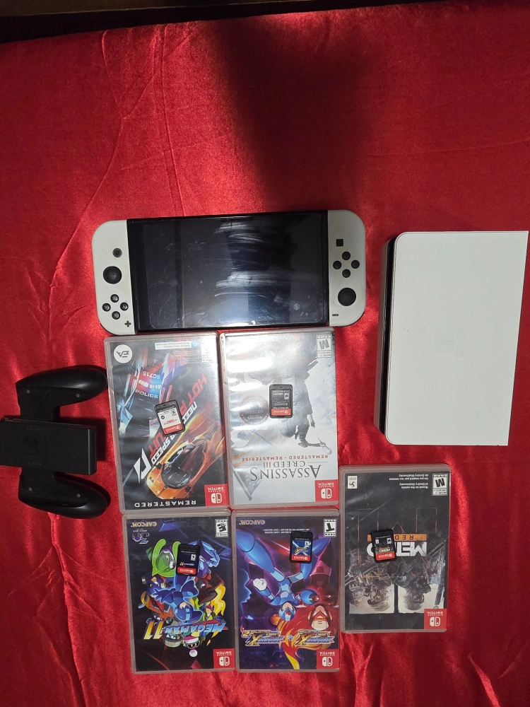 Selling a Nintendo Switch OLED model in white! It comes with the dock and joy-con controller. Included are 5 games: Need for Speed Remastered, Assassin's Creed III Remastered, Mega Man 11, Mega Man X Legacy Collection, and ME3