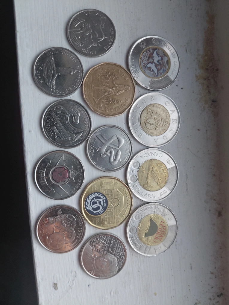 A collection of Canadian coins, including various denominations and commemorative editions. Great for collectors or those interested in Canadian currency!