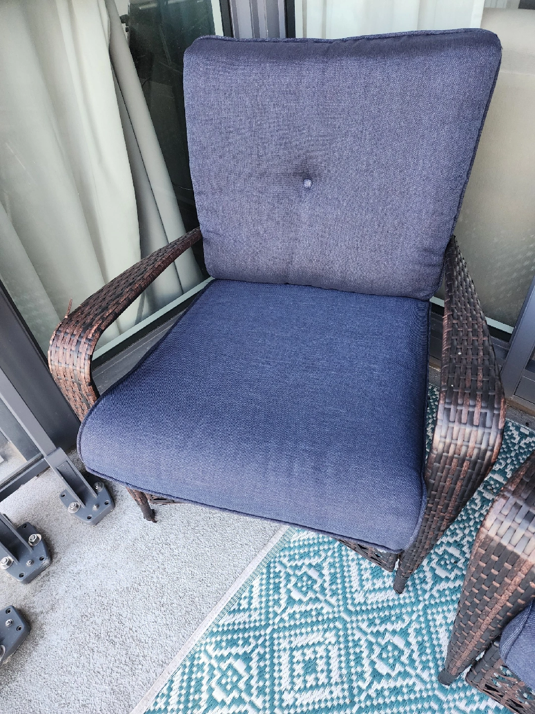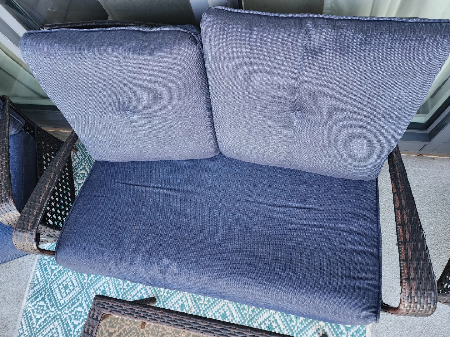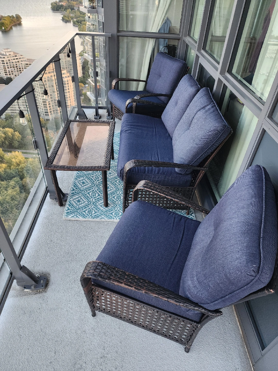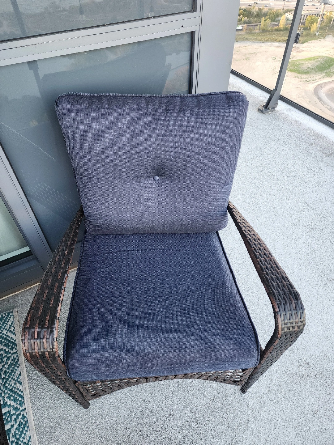 Selling a gently used patio conversation set! It includes a loveseat, two chairs, and a small glass-topped table. Cushions are a nice dark blue colour. Perfect for enjoying those summer evenings on your balcony or patio Nice large Deck storage for cushions
