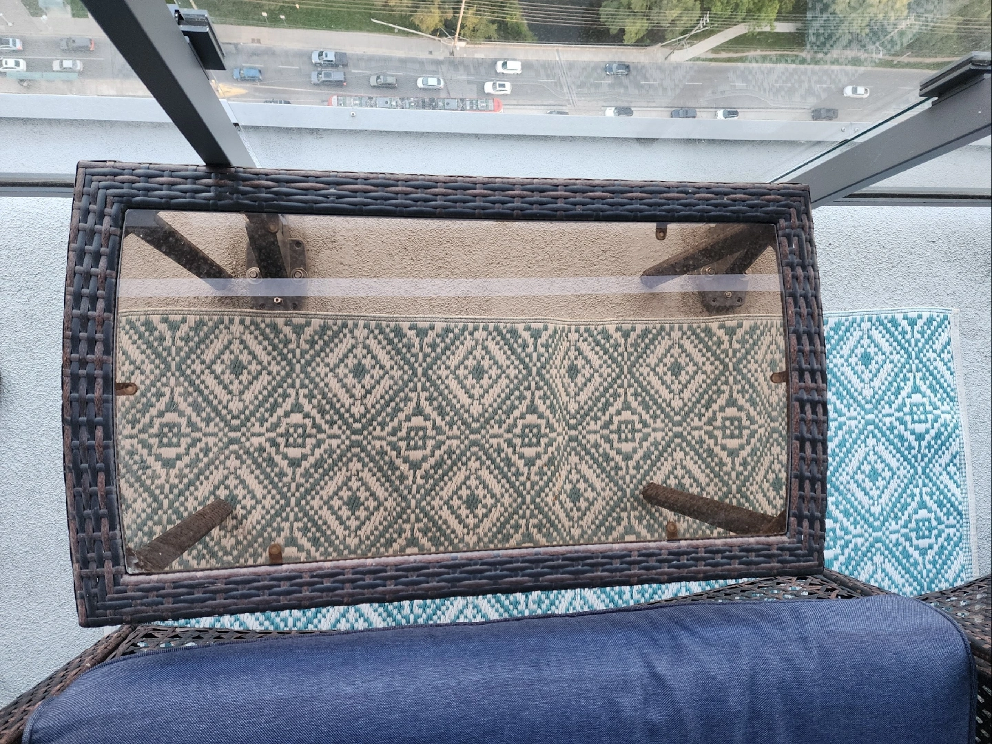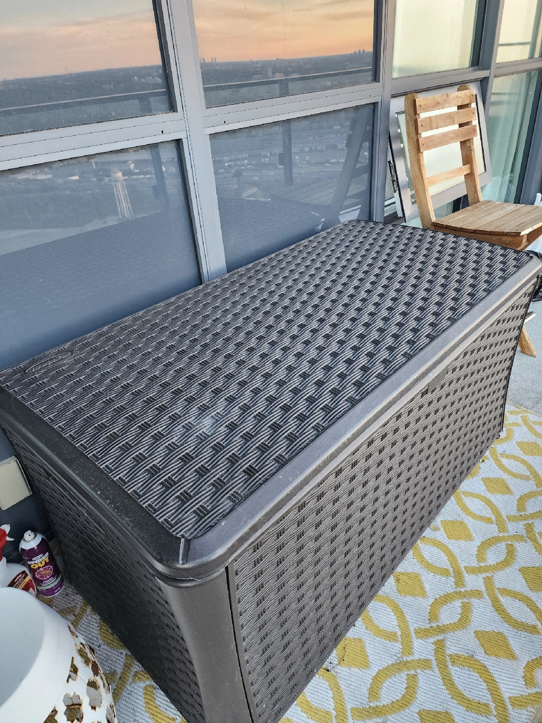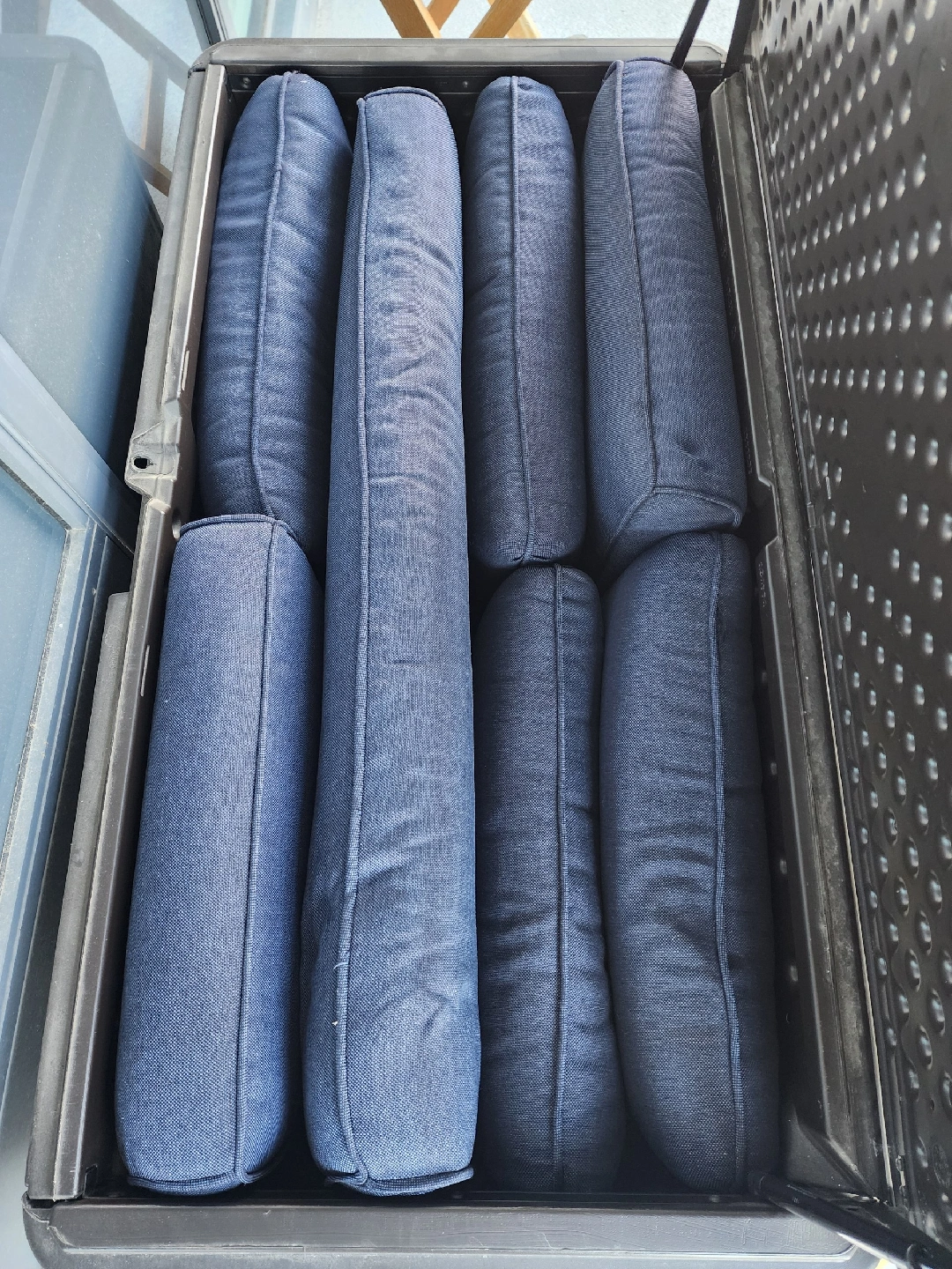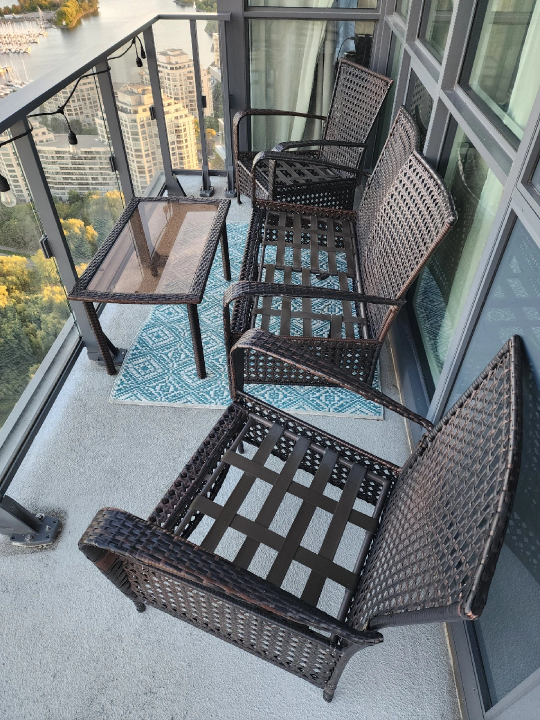 Selling a gently used patio conversation set! It includes a loveseat, two chairs, and a small glass-topped table. Cushions are a nice dark blue colour. Perfect for enjoying those summer evenings on your balcony or patio Nice large Deck storage for cushions